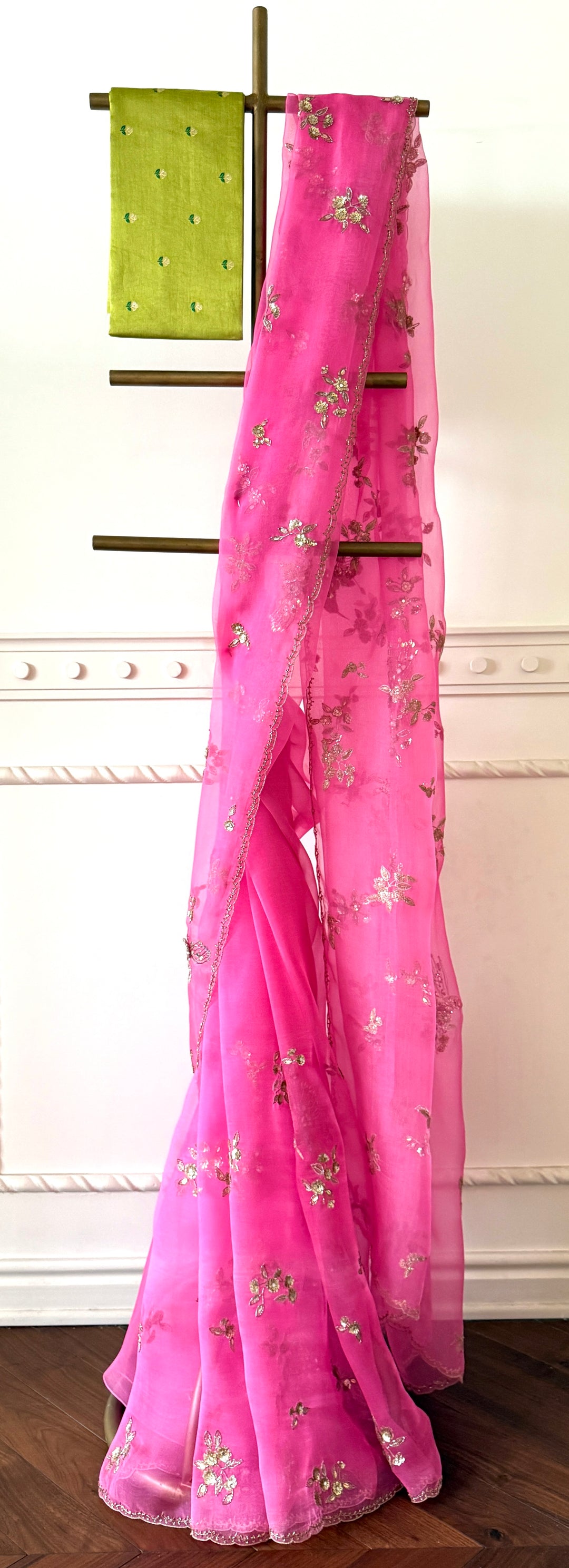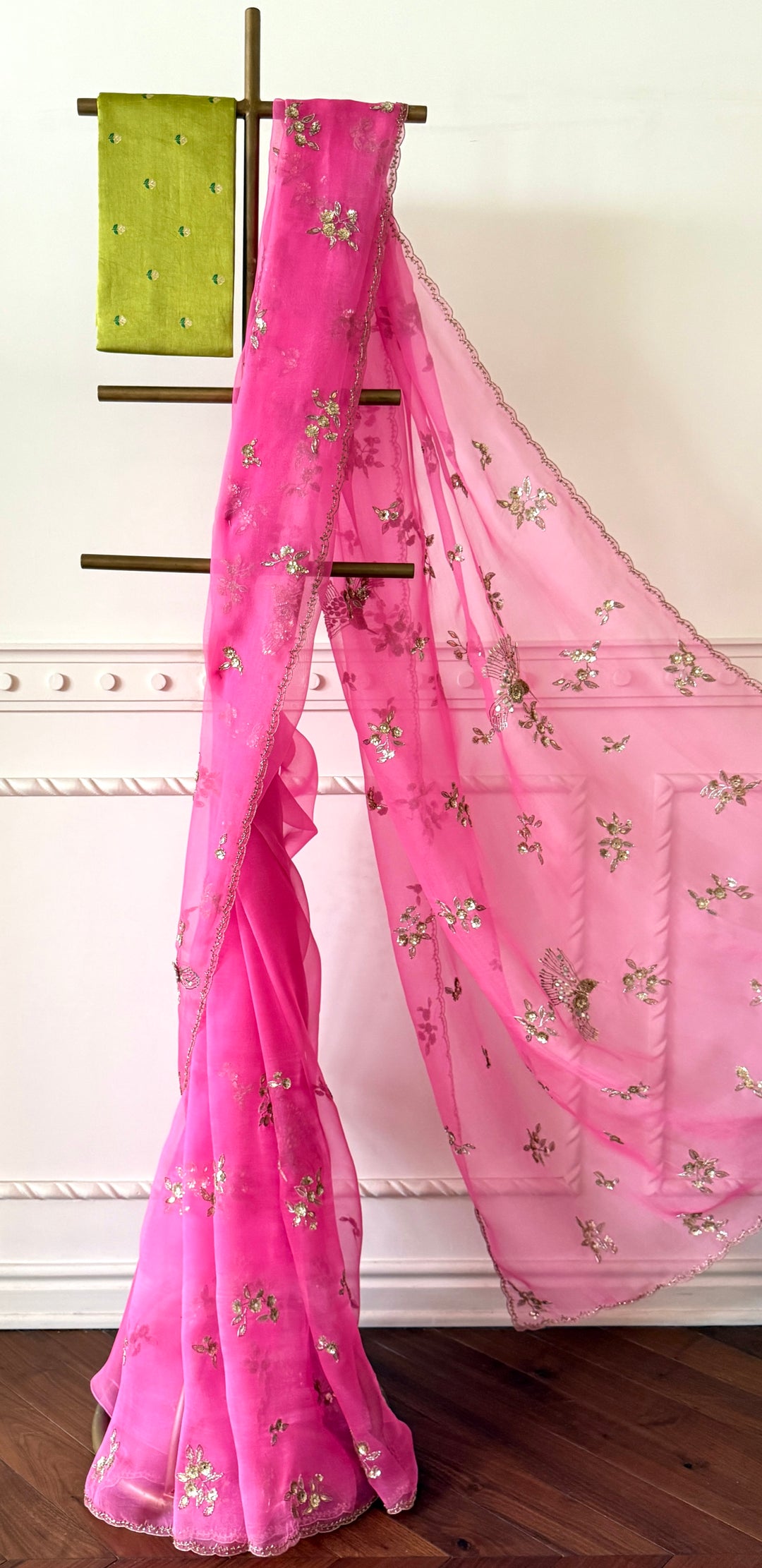 Hot pink hand embroidered organza saree with unstitched blouse fabric