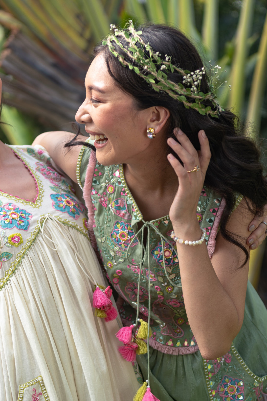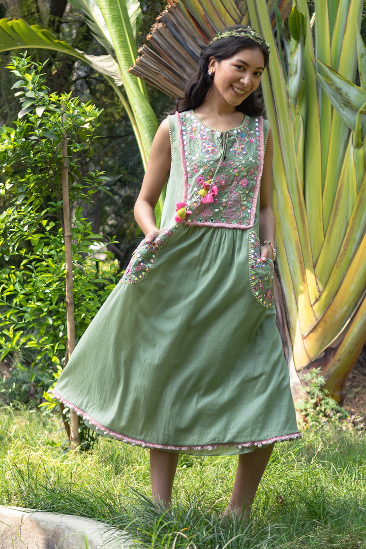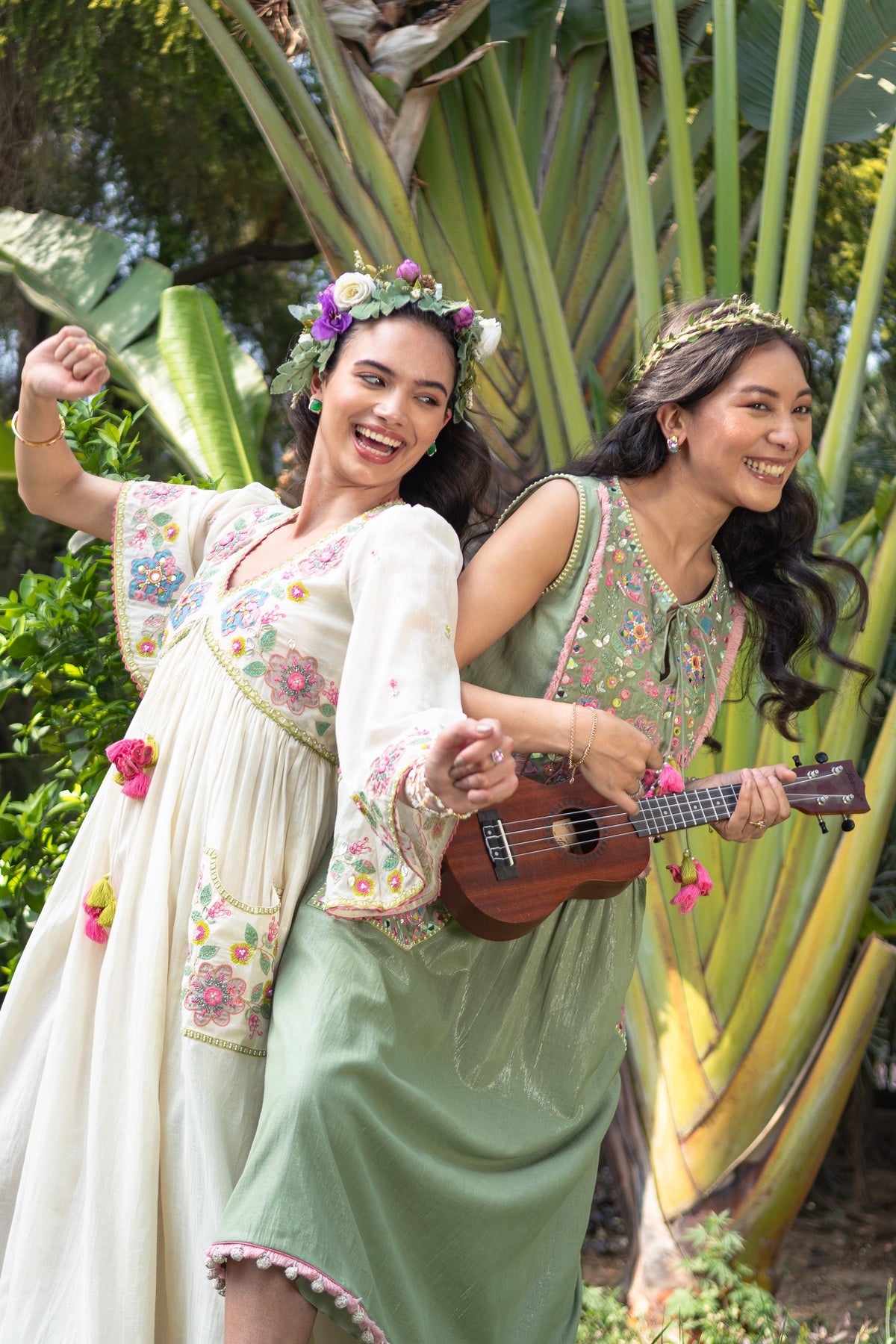 Step into enchantment with our Magic Dress, adorned in mesmerizing mirror and brocade work. Each stitch whispers tales of mystery and allure, weaving a spell of timeless elegance.
