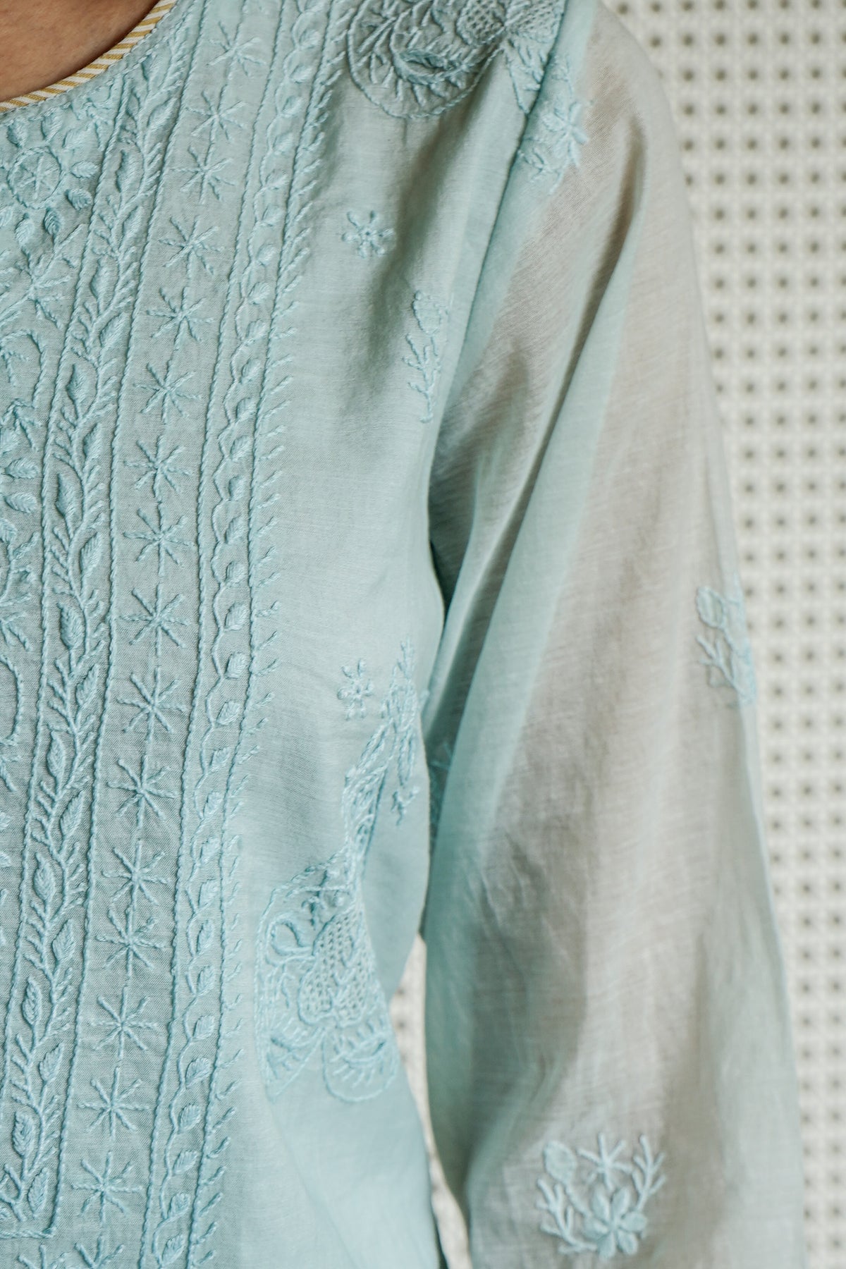 A graceful blue kurta set featuring delicate chikan embroidery, blending traditional craftsmanship with effortless elegance. Perfect for festive occasions, casual gatherings, or daytime celebrations, this set offers comfort with a refined, timeless charm