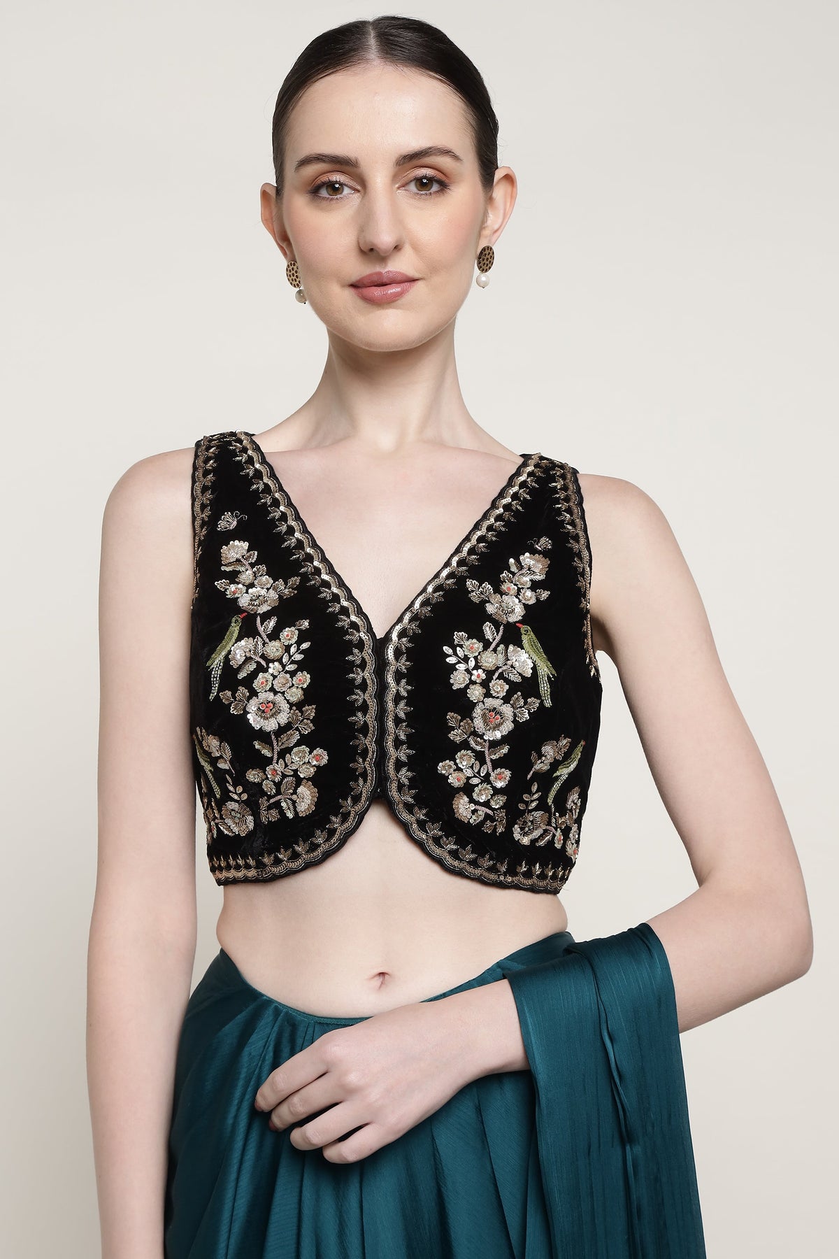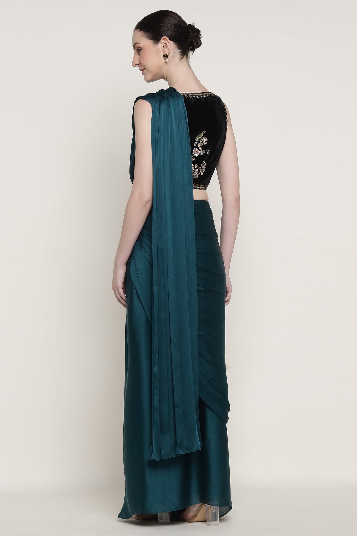 The Noor-e-Phool Drape Saree features a rich teal drape paired with a black blouse adorned in intricate floral embroidery. Effortlessly elegant and contemporary, this saree is perfect for evening soirées, festive celebrations, and modern wedding events.