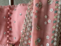 Introducing our Peach Persian Scattered Flower Saree, a masterpiece that exudes timeless elegance and grace. Crafted from the finest chiffon, this saree is a perfect blend of tradition and modernity. The saree features delicate hand embroidery with sequins and beads, creating a mesmerizing scattered flower pattern that adds a touch of sophistication. Paired with it is a puff sleeve blouse, also hand embroidered, enhancing the overall allure of the ensemble.