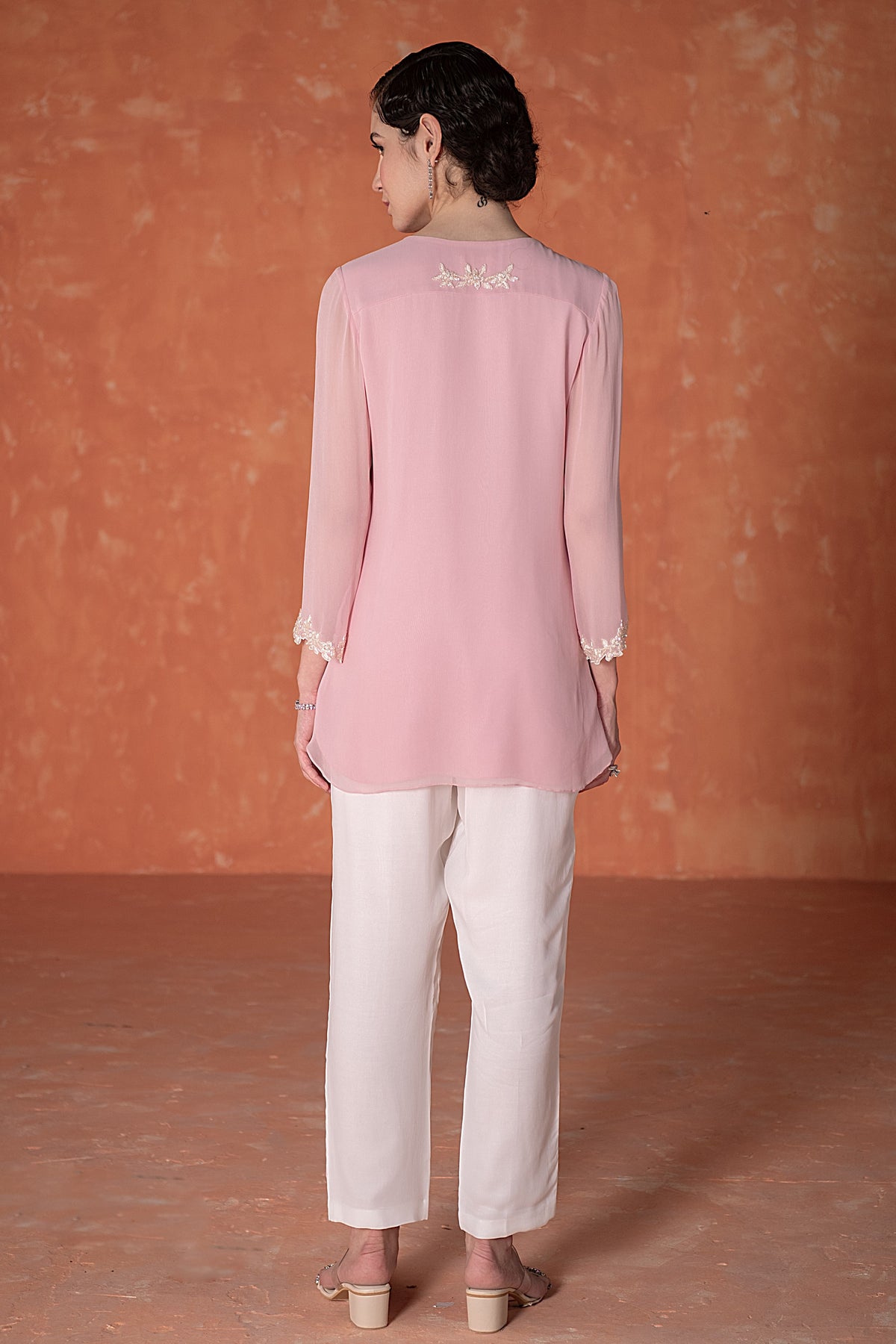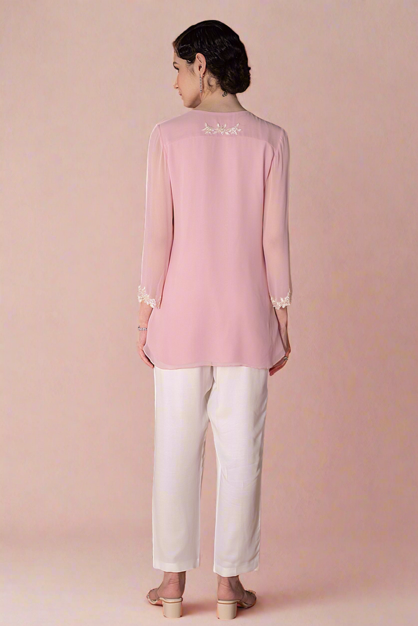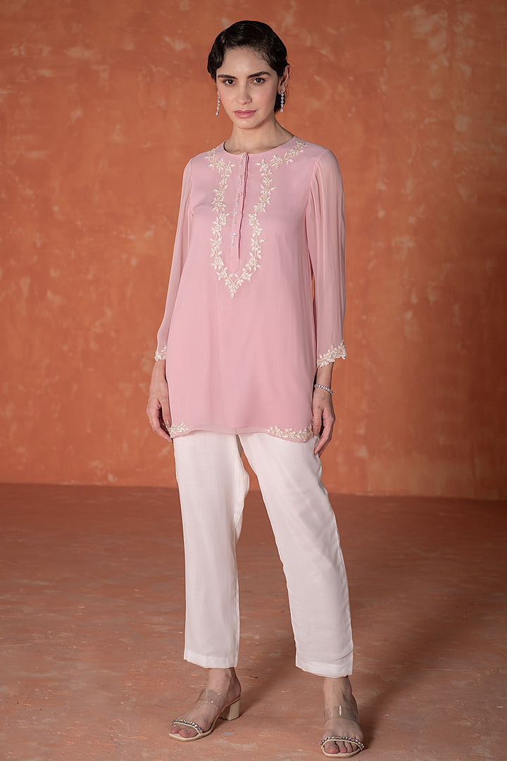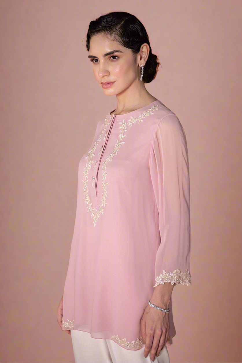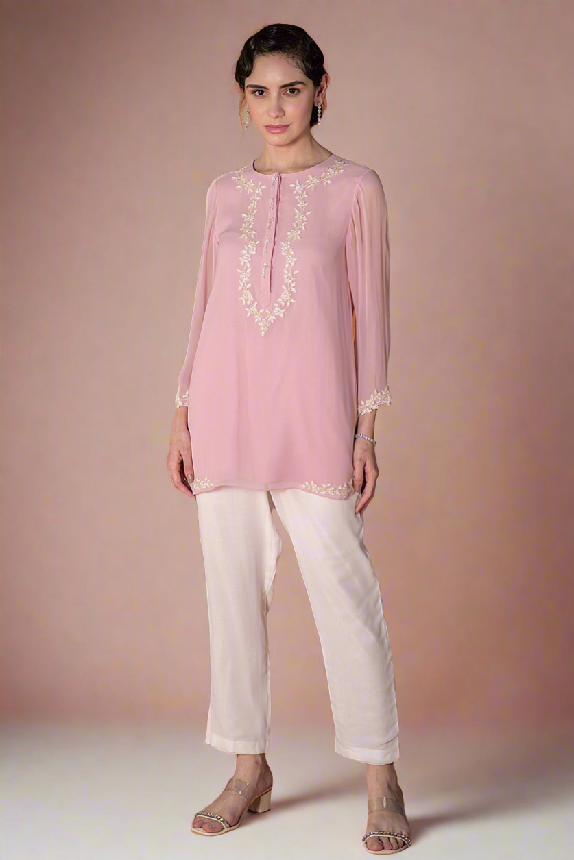 A stunning blend of tradition and modernity with intricate Dori work detailing. Effortlessly chic, this ensemble combines cultural allure and contemporary style in perfect harmony. Crafted from luxurious Georgette fabric, the Pink Adena Tunic is ideal for making a captivating statement while feeling at ease.