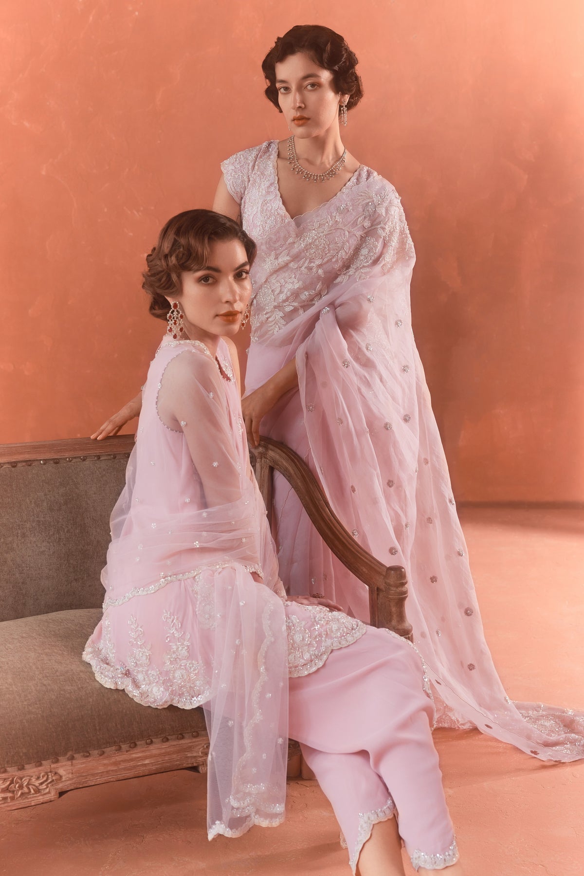 Indulge in the luxurious feel of georgette against your skin, while the net dupatta adds an ethereal touch to your ensemble. Embrace the beauty of craftsmanship and impeccable design with our Pink Amaria A-line Short Designer Kurta Set, your ticket to standout style.