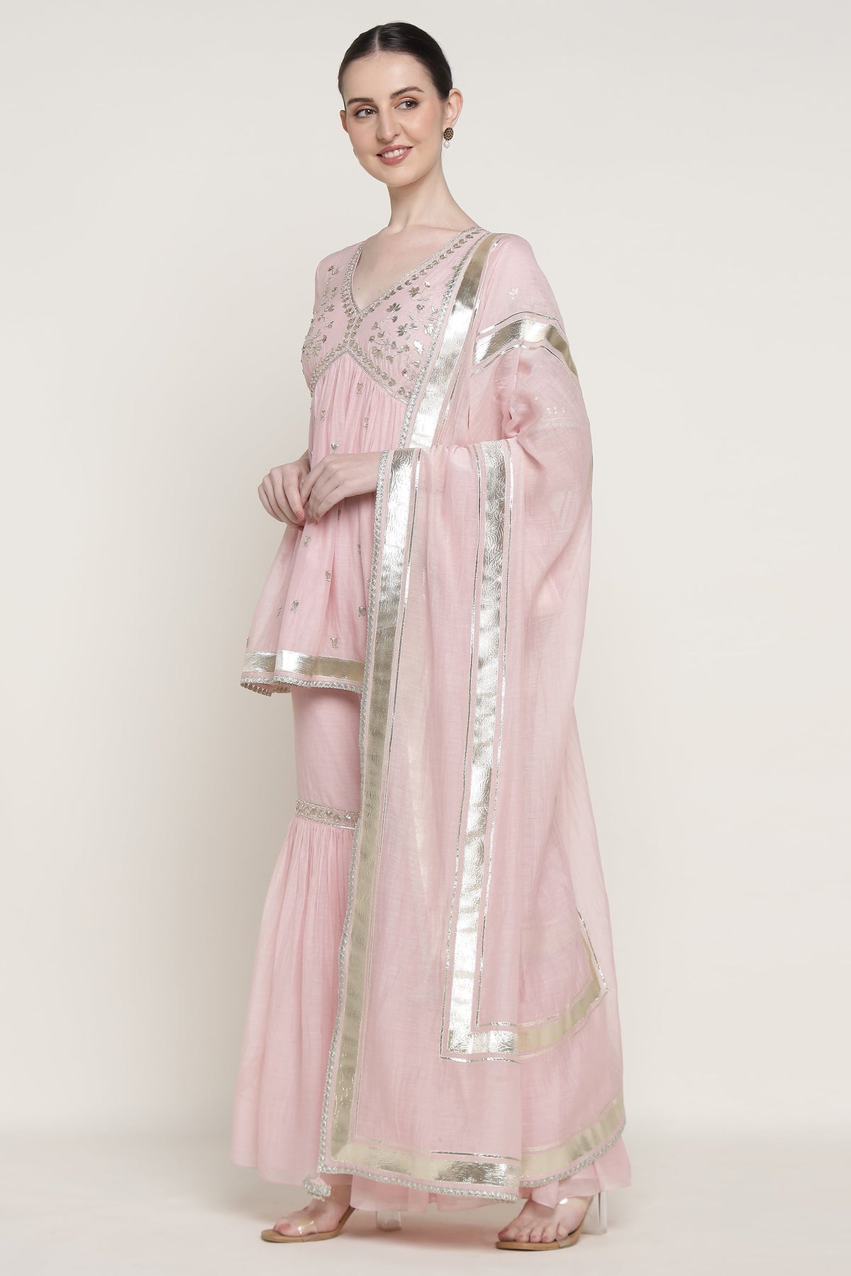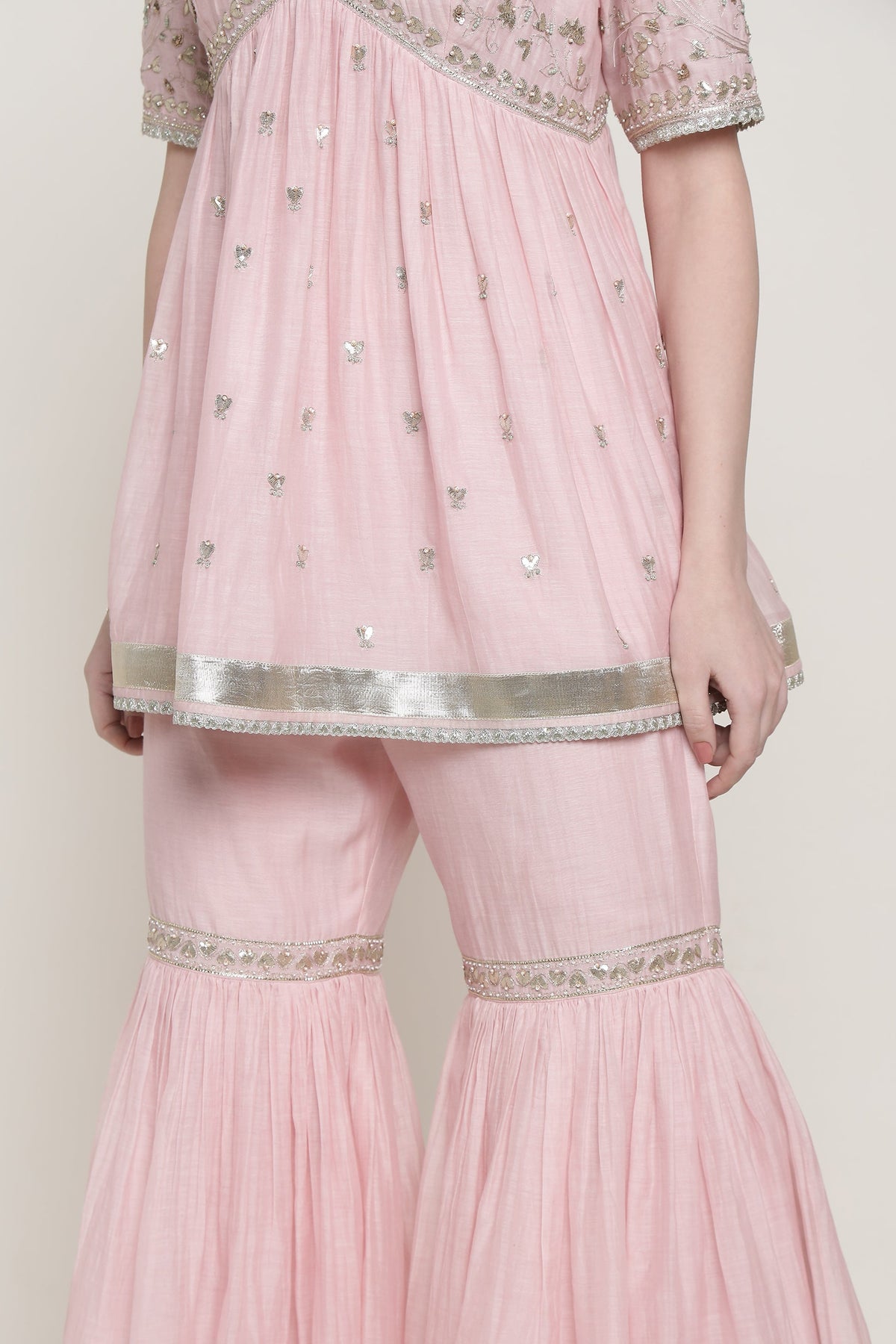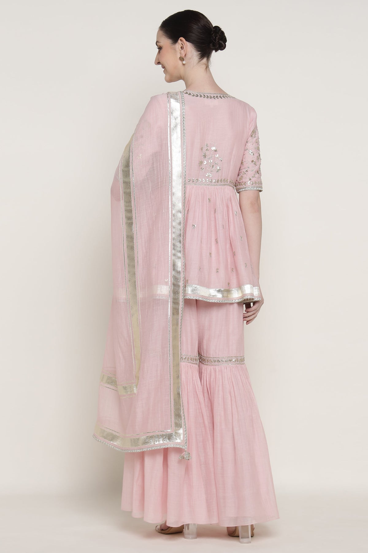 The Delara Short Peplum Set showcases a soft blush pink peplum top with delicate gold embroidery, paired with flowing sharara pants and a sheer dupatta. Light, graceful, and festive—perfect for intimate celebrations and elegant daytime occasions.