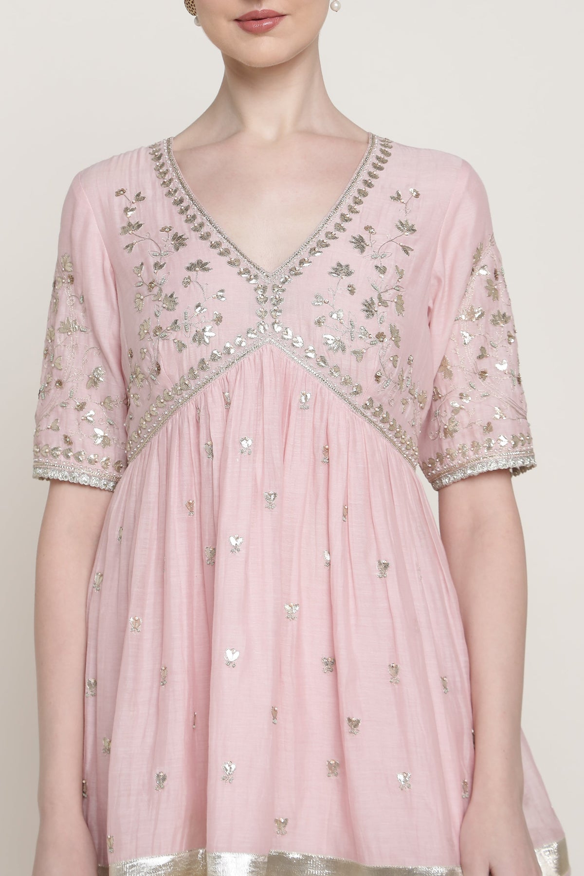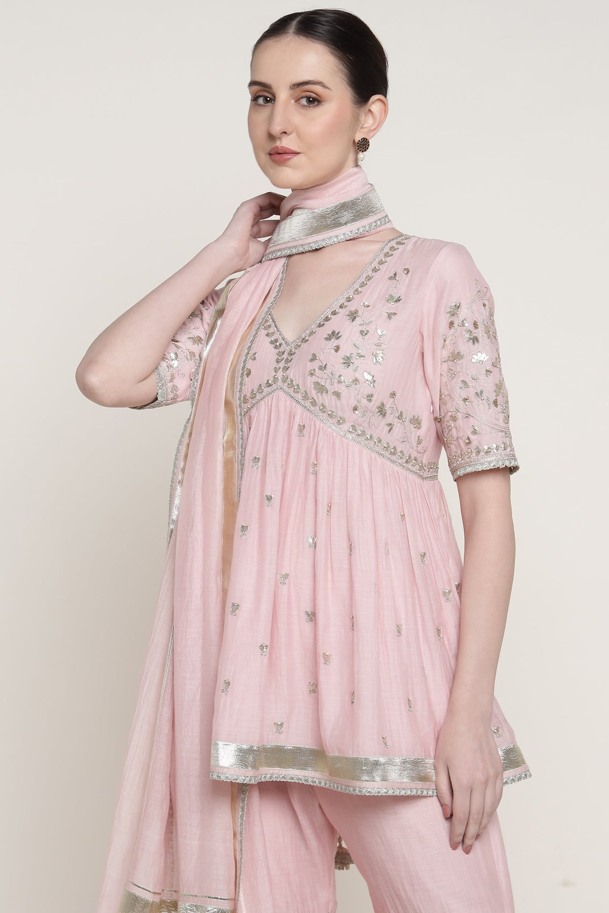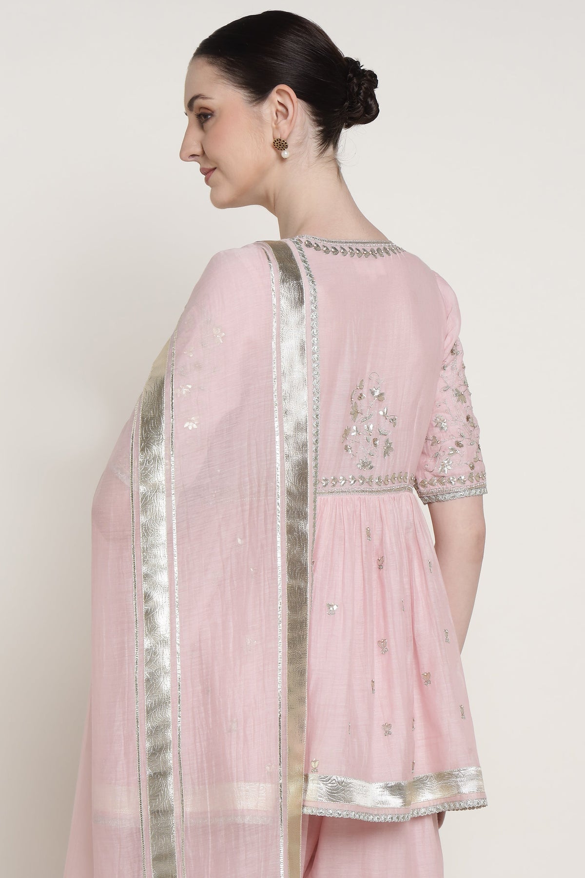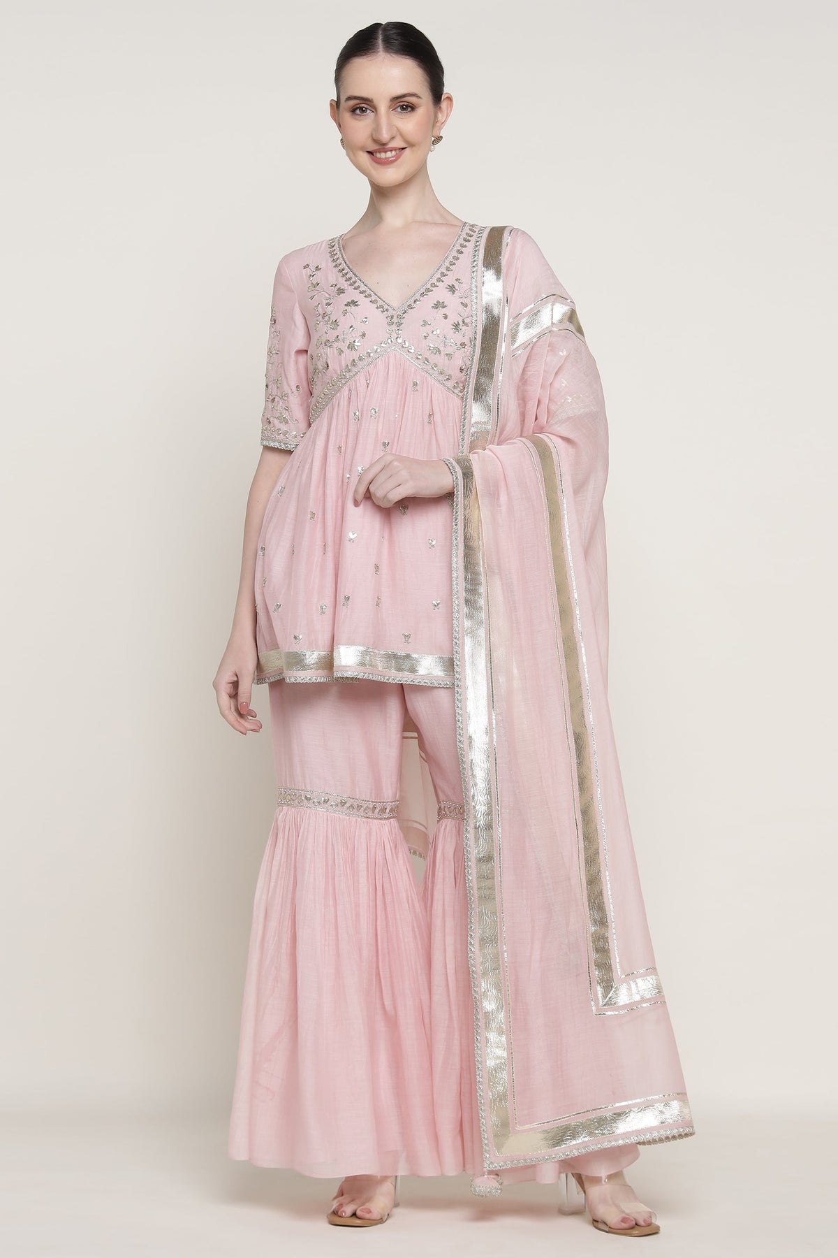 The Delara Short Peplum Set showcases a soft blush pink peplum top with delicate gold embroidery, paired with flowing sharara pants and a sheer dupatta. Light, graceful, and festive—perfect for intimate celebrations and elegant daytime occasions.