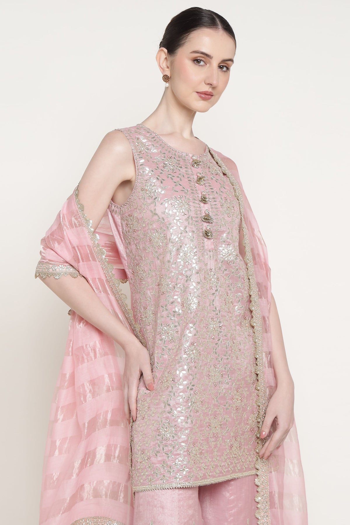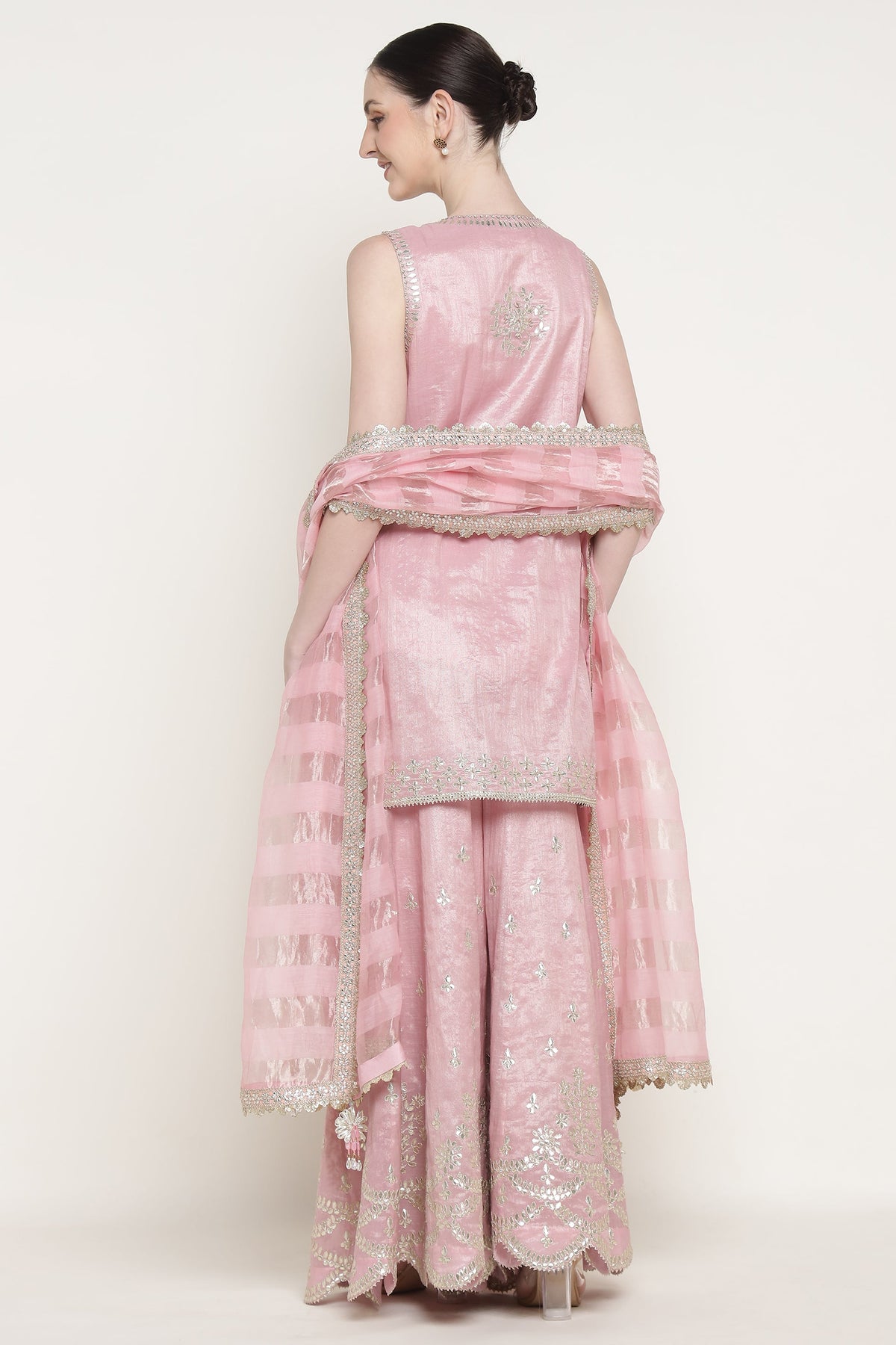 The Elena Sharara Set features a soft blush pink kurta adorned with intricate gold embroidery, paired with flowy sharara pants and a sheer, striped dupatta. Elegant, festive, and timeless—perfect for weddings, celebrations, and special occasions.