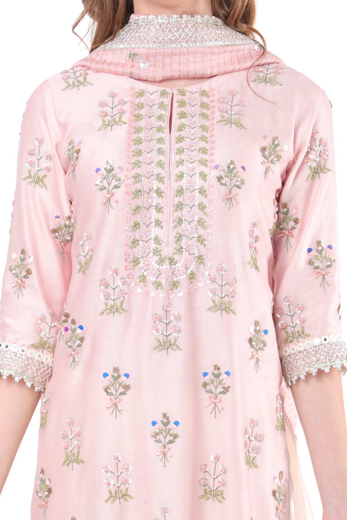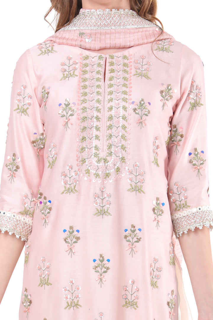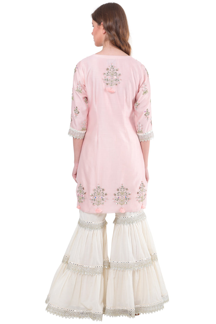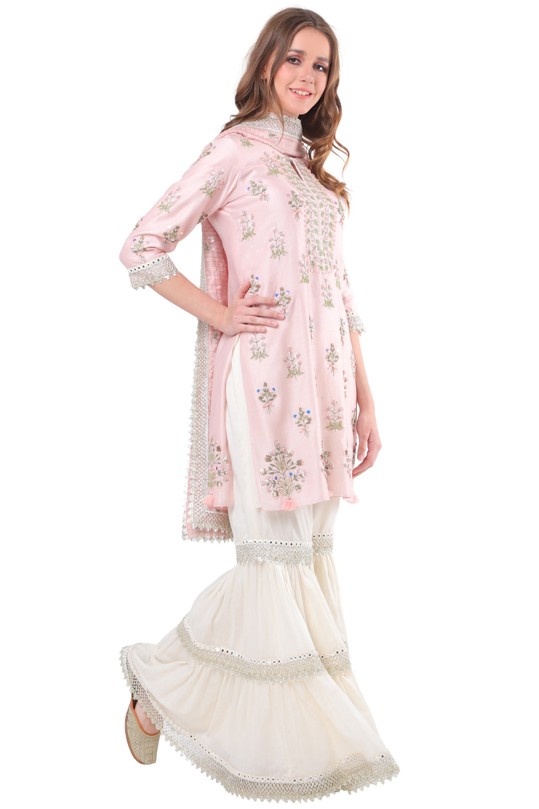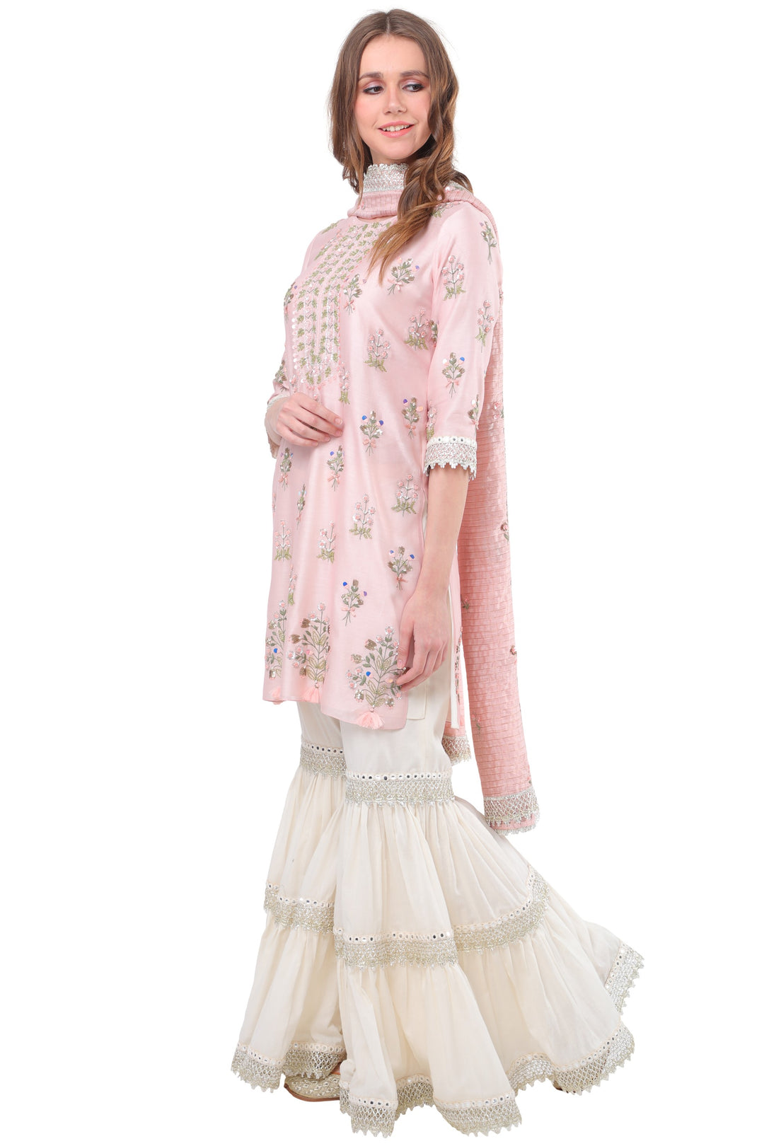 Elevate your ethnic style with our Pink Mirror Flower Garara Set from "Summer by Priyanka Gupta." This stunning ensemble features intricate mirror work and delicate floral embroidery, adding a touch of elegance to your wardrobe. The soft pink hue exudes femininity, while the garara pants offer a modern twist to traditional attire.