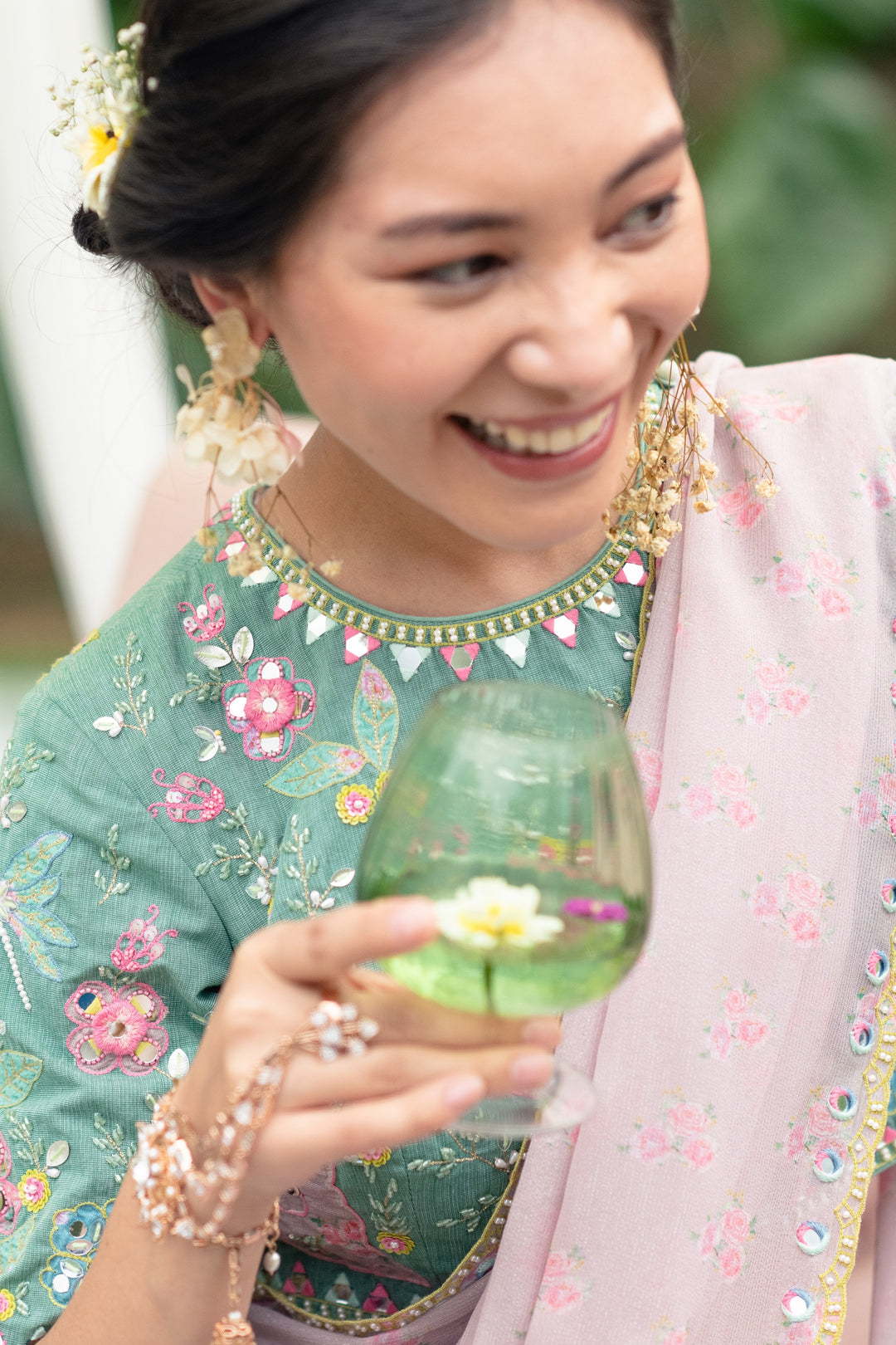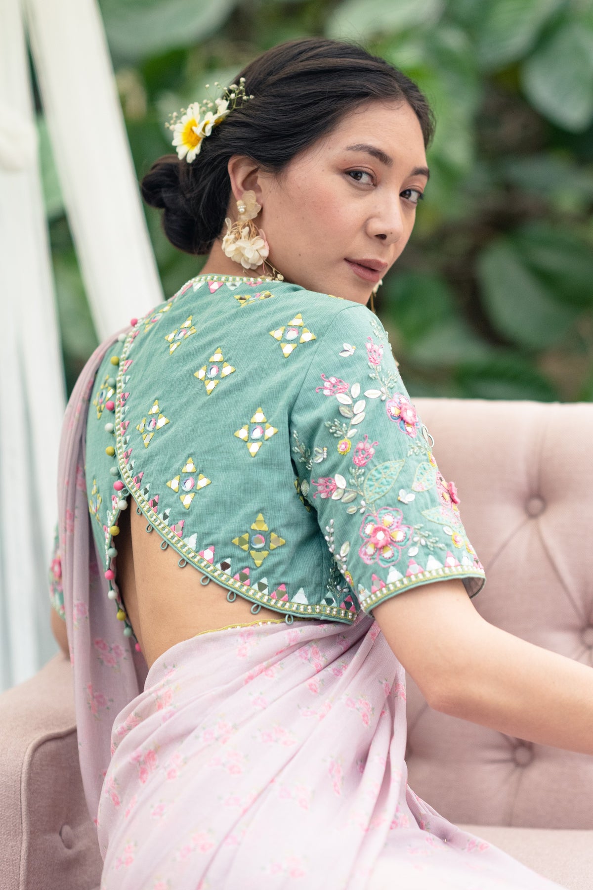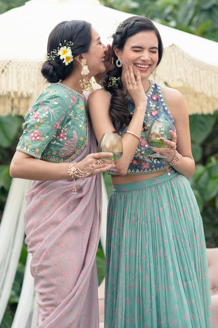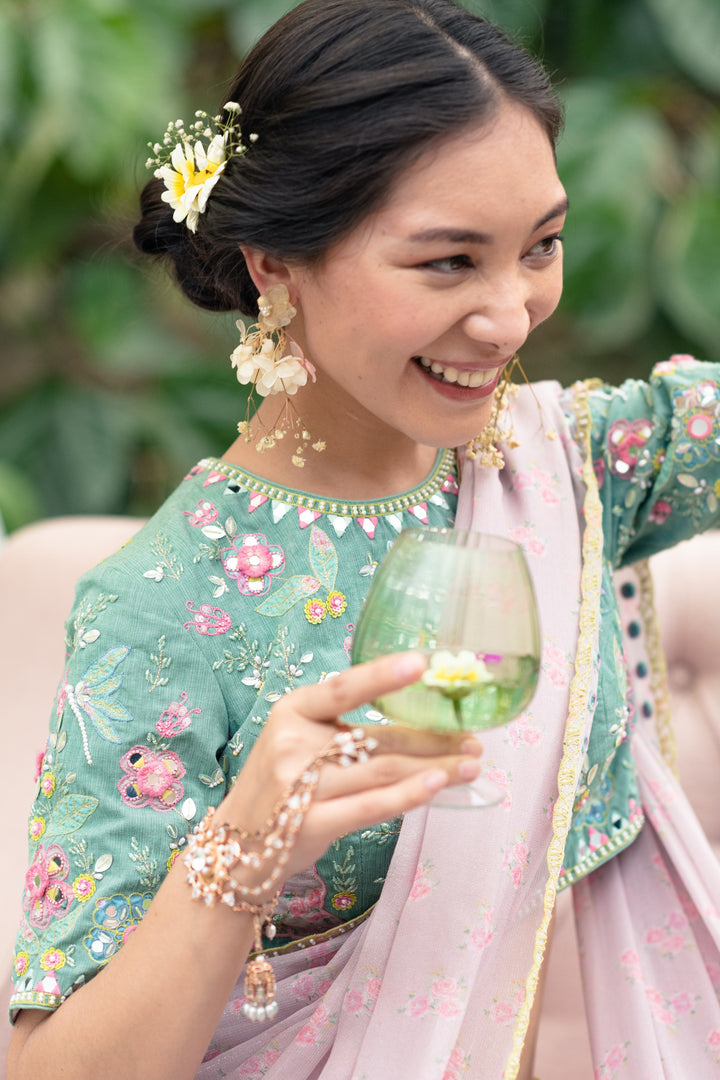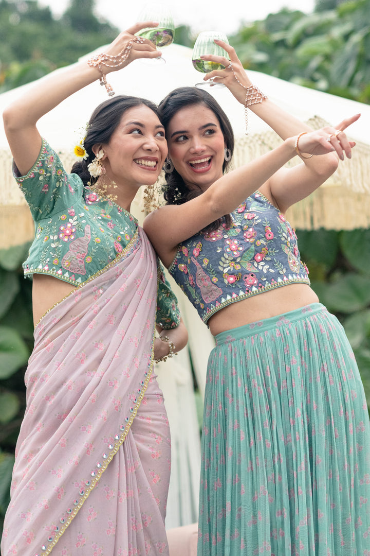 Drape yourself in colourful dreams with our Pink Rainbow Saree, kissed by Georgette Lurex. Paired with a Green Embroidered Magic Top, adorned with mirrors, brocade, and pearls, it's a symphony of magic and allure.