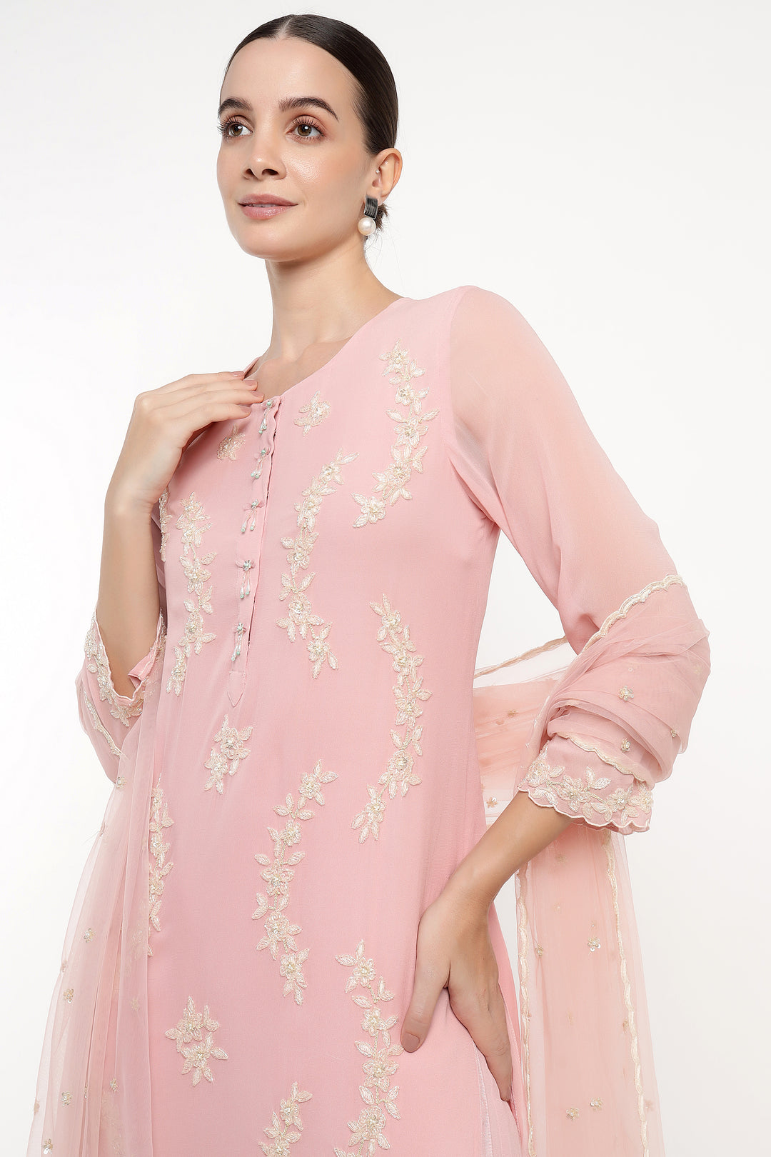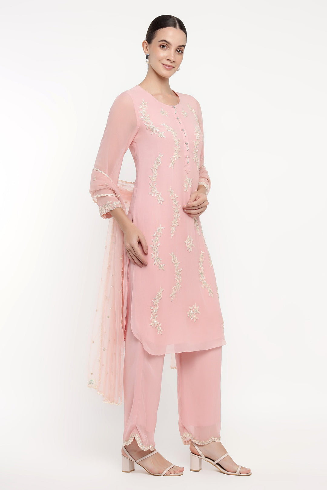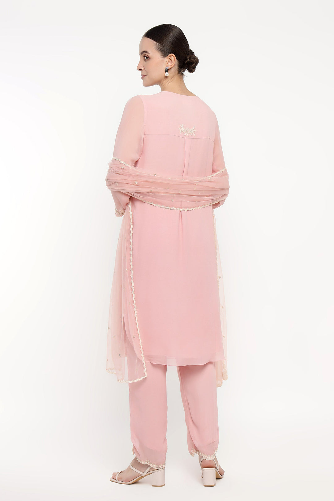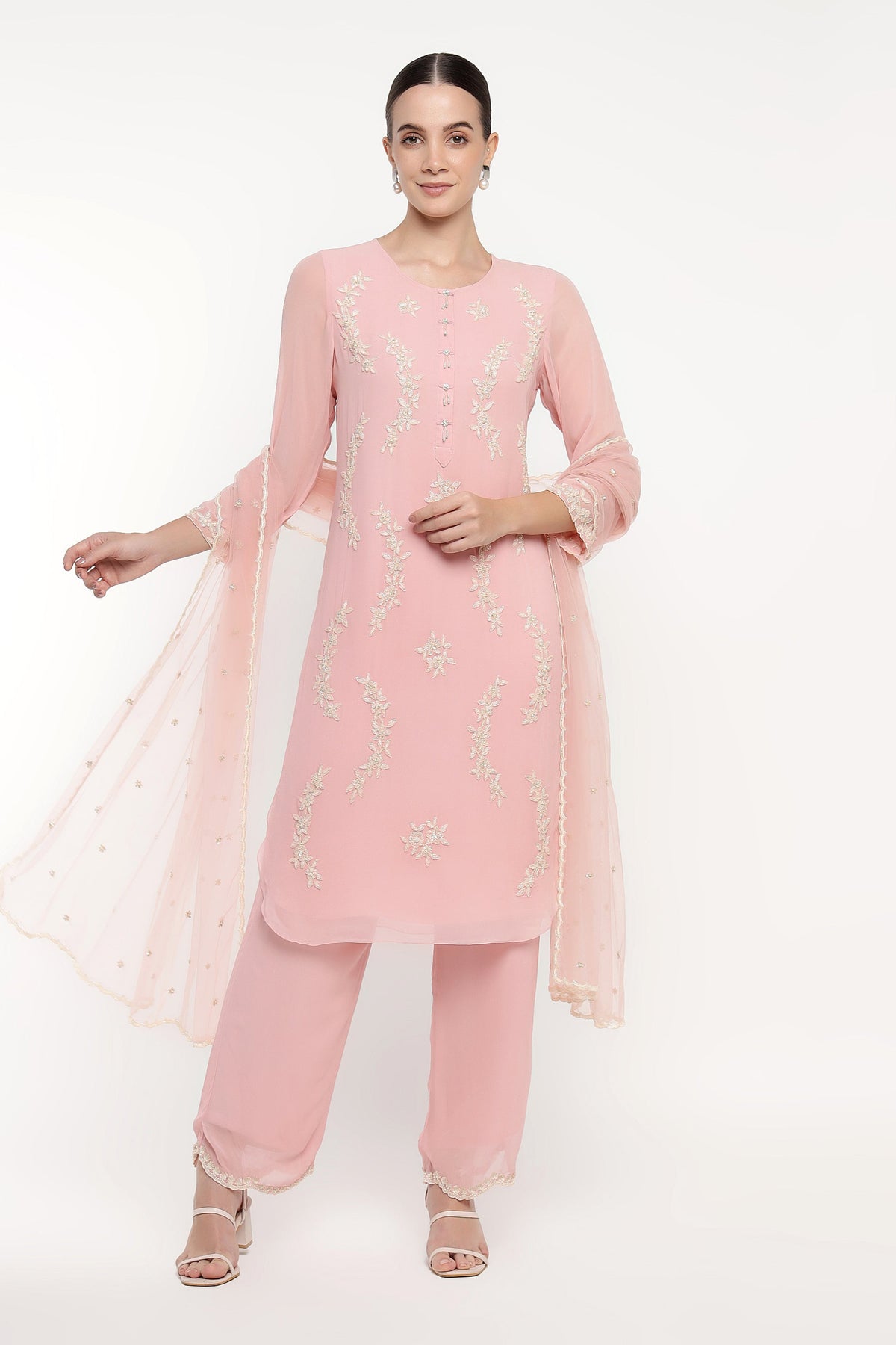 The Selene Pink Georgette Kurta Set radiates sophisticated charm. Intricate cutdana embroidery graces this light, festive kurta set, ideal for engagement, wedding guests, and Diwali. A premium embroidered kurta set that blends comfort with occasion elegance, perfect for your summer celebrations.