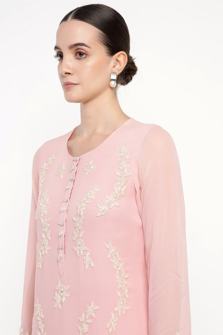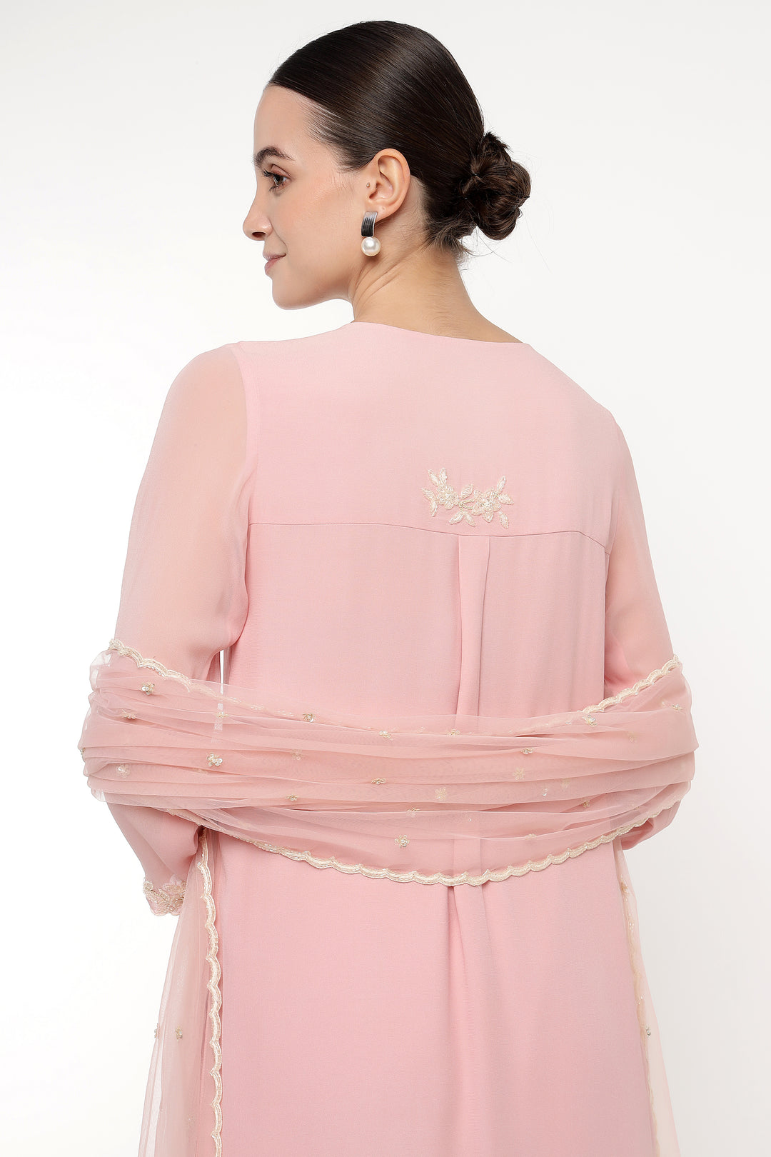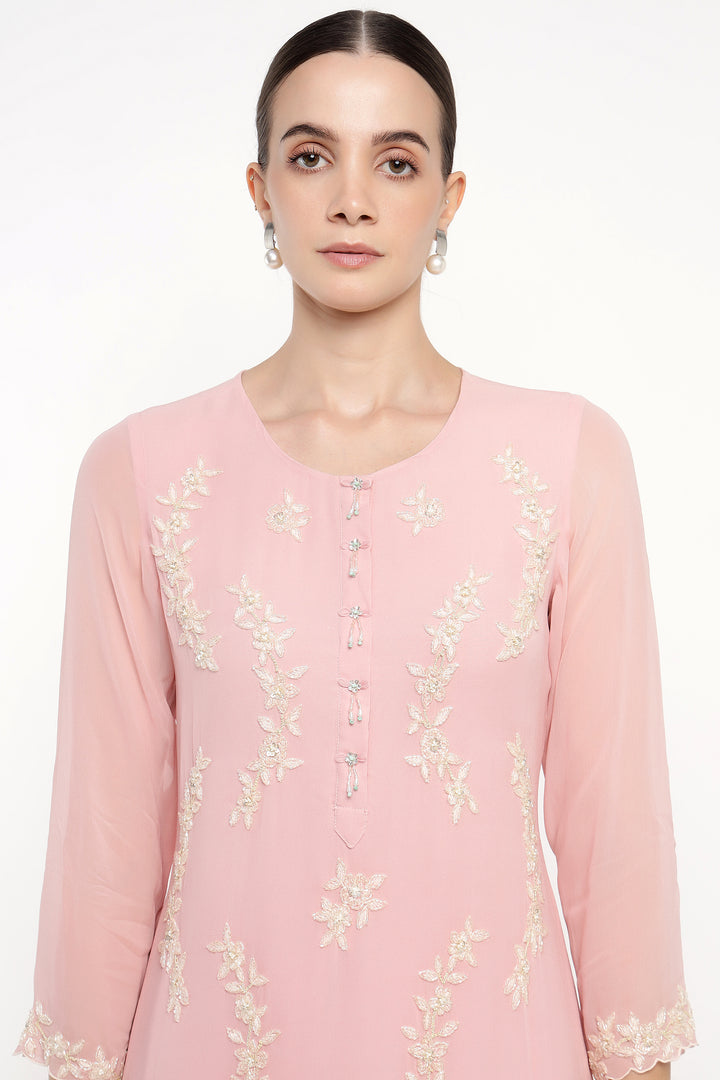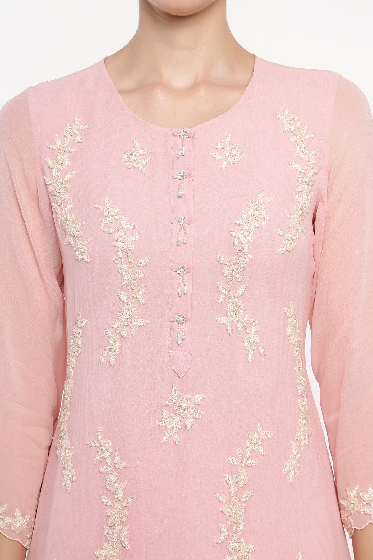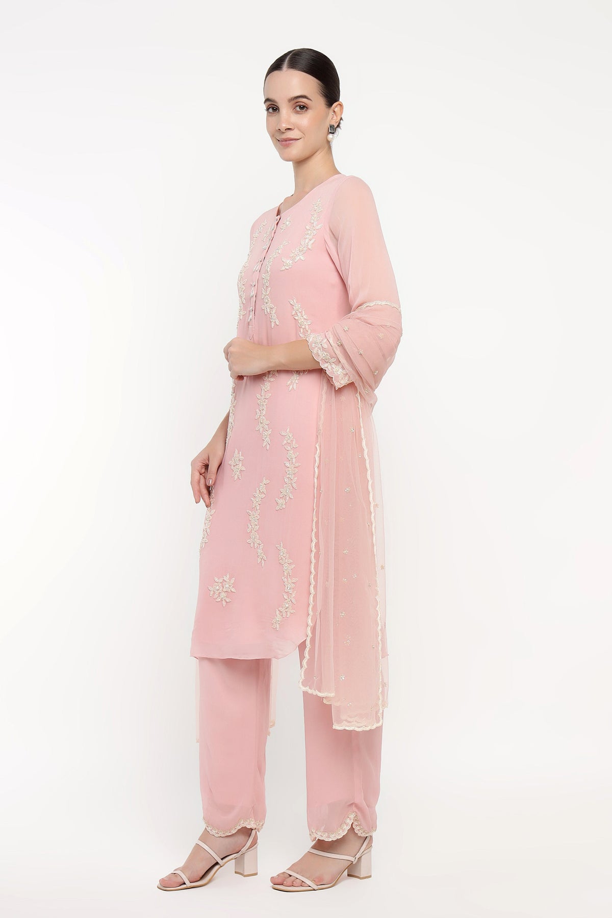 The Selene Pink Georgette Kurta Set radiates sophisticated charm. Intricate cutdana embroidery graces this light, festive kurta set, ideal for engagement, wedding guests, and Diwali. A premium embroidered kurta set that blends comfort with occasion elegance, perfect for your summer celebrations.