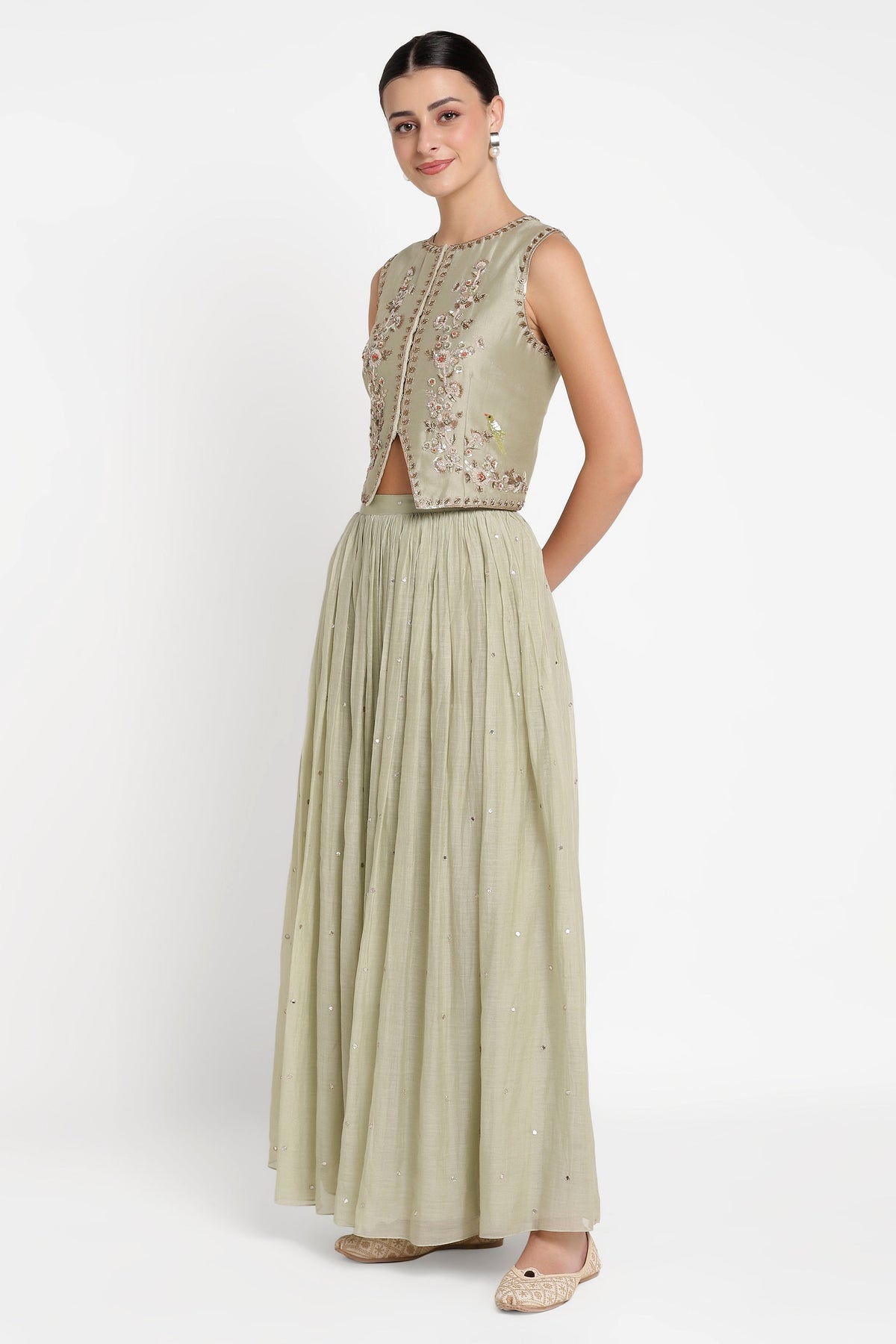 Woman wearing a light green sleeveless top with floral embroidery and a matching skirt on a white background