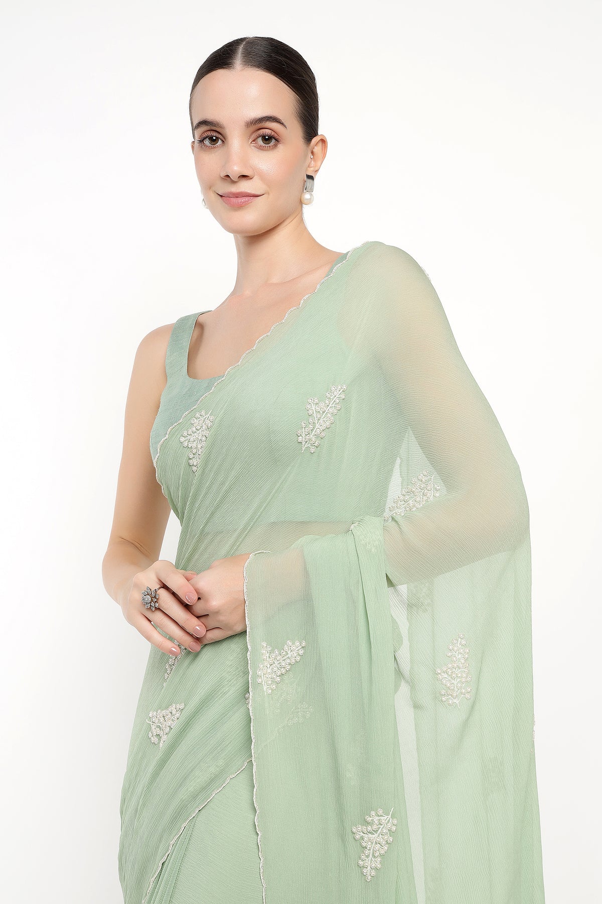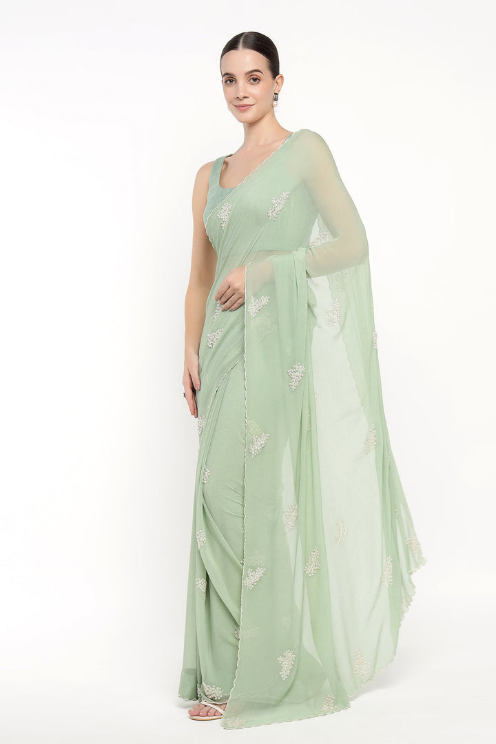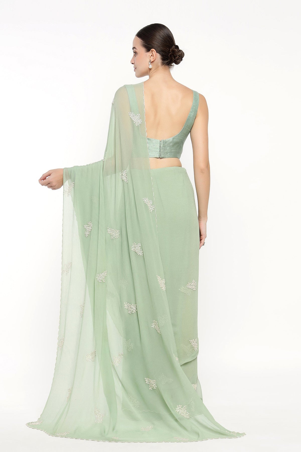 Experience the ethereal charm of our Teal Chiffon Saree, exquisitely hand-embroidered with delicate cutdana work. This lightweight masterpiece is perfect for Diwali, engagement, or wedding functions. Its graceful drape creates an unforgettable impression. A stunning choice for anniversaries and special celebrations, embodying refined Indian elegance.