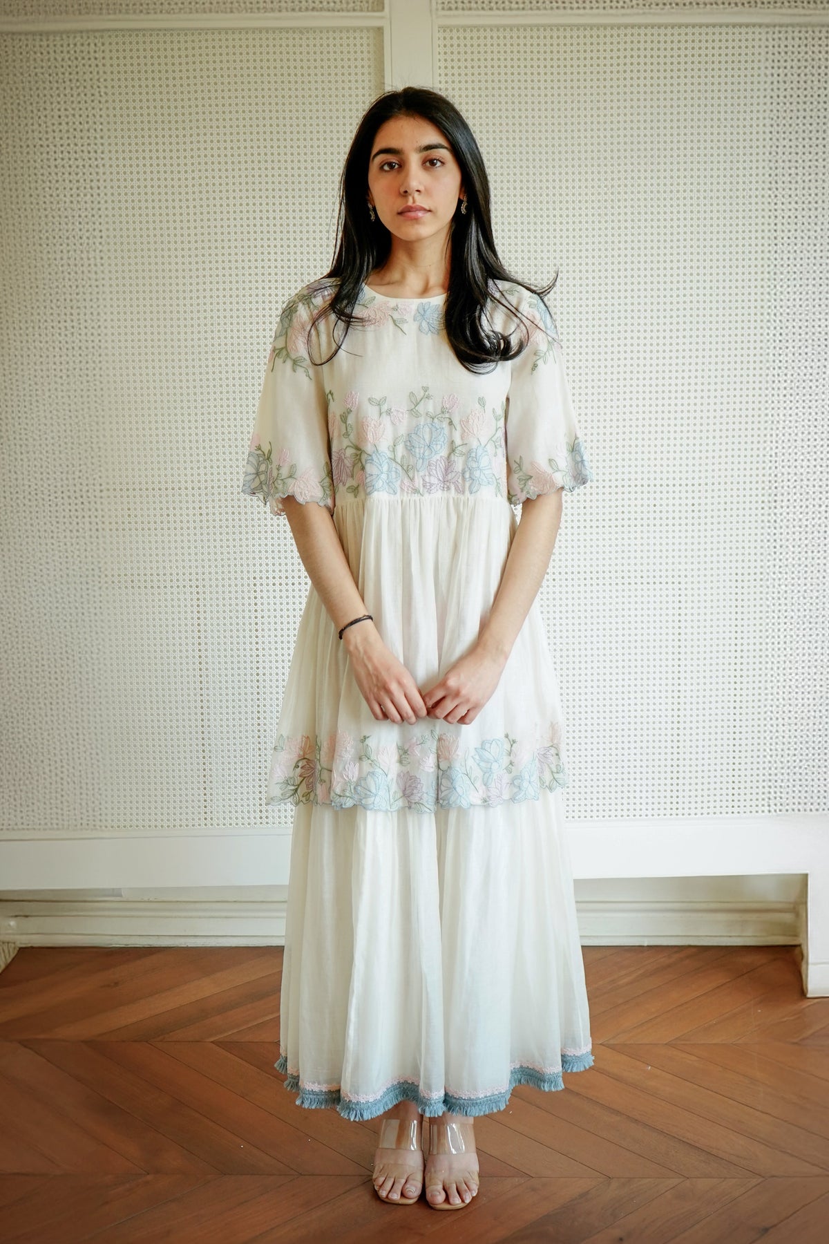 White Floral Dress featuring intricate bakhiya embroidery. Made from cotton fabric, this elegant dress is perfect for special occasions or everyday wear. The delicate floral pattern and ornate bakhiya work add a touch of sophistication and charm.