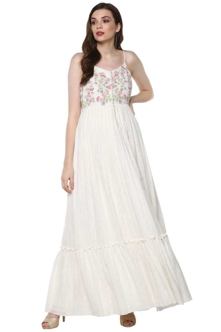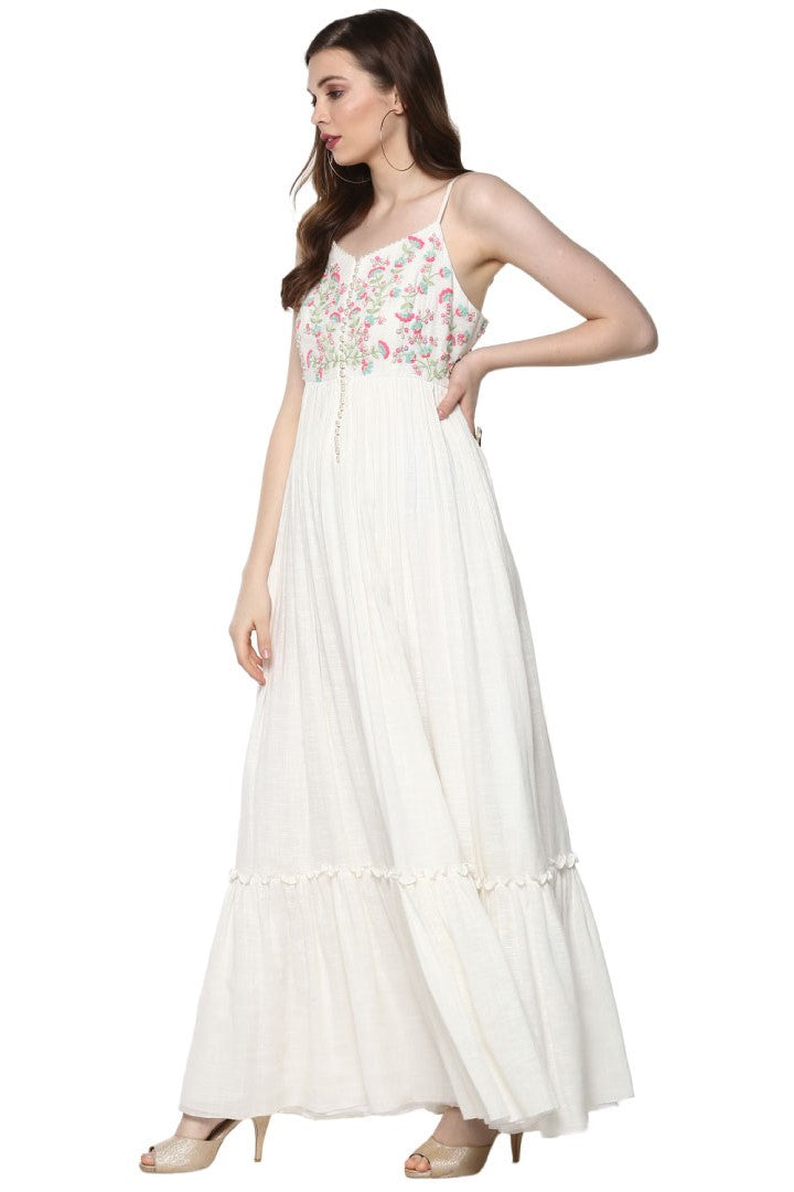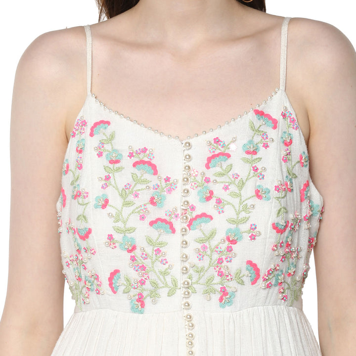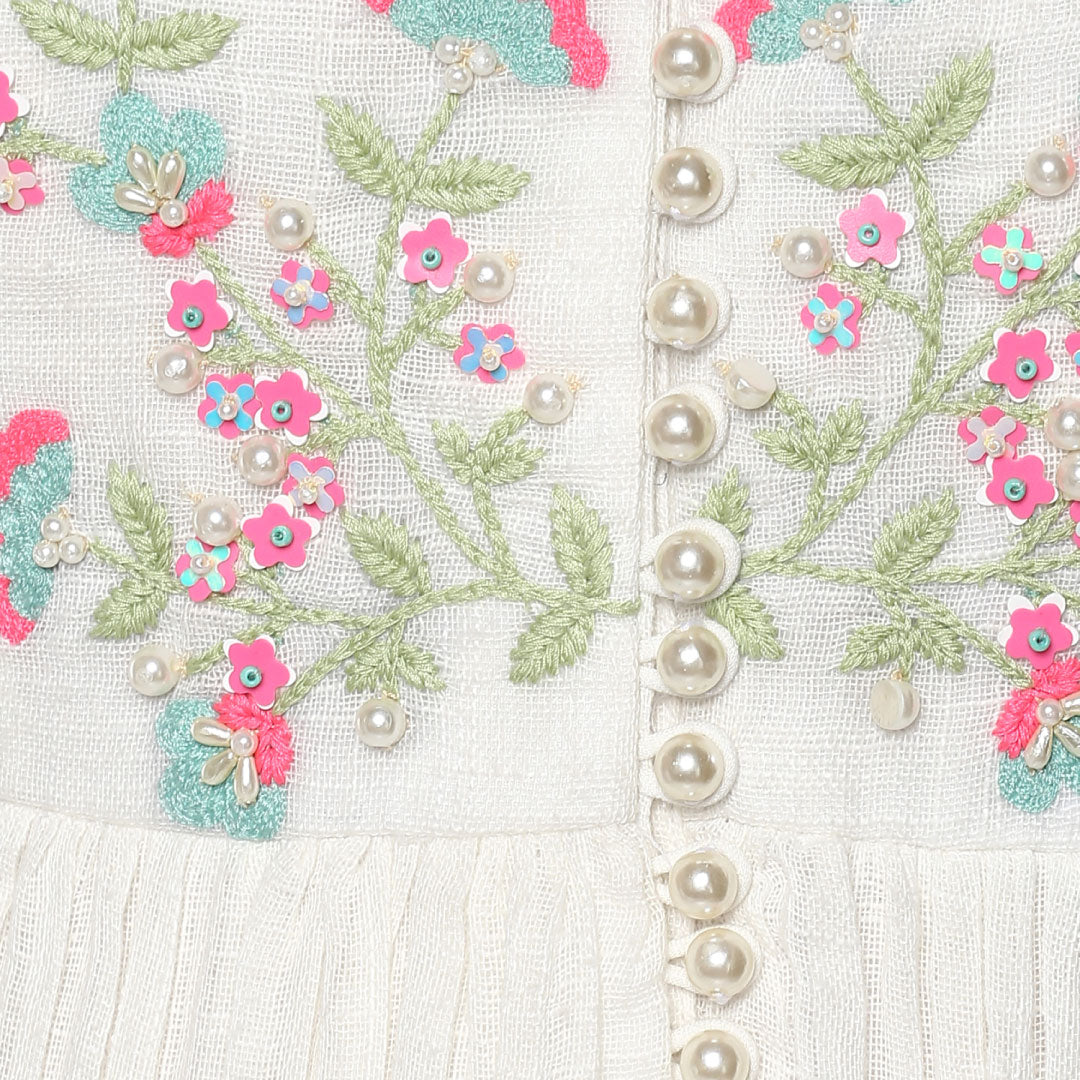 White cotton dress with intricate thread work embellishments.