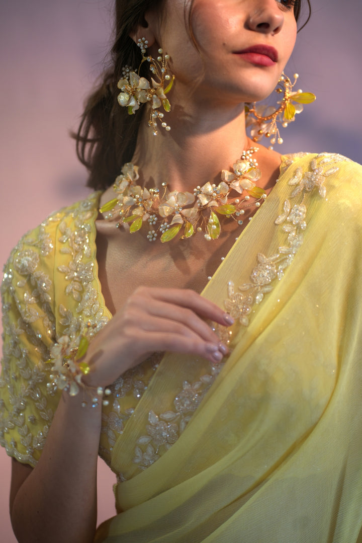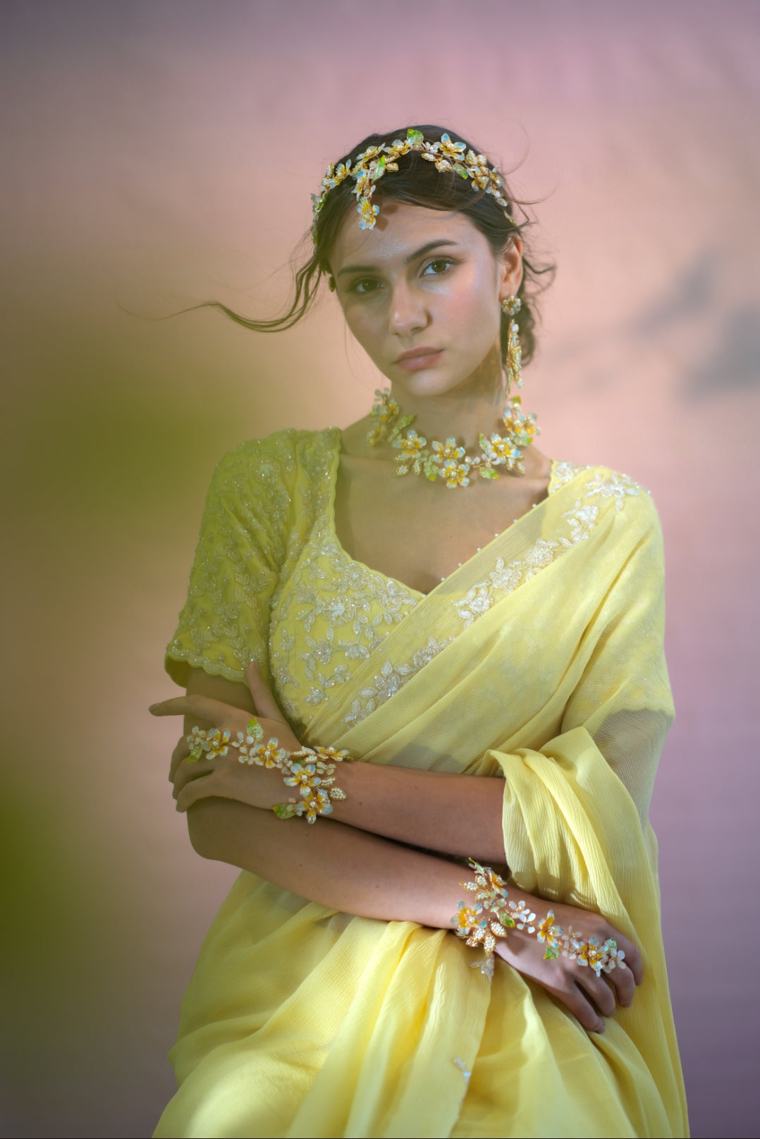 Elevate your style, embrace tradition, and make a statement with the Yellow Adena Vine Saree. Whether you're a bride, a bridesmaid, or a guest of honor, this saree promises to be the embodiment of grace on your special day.