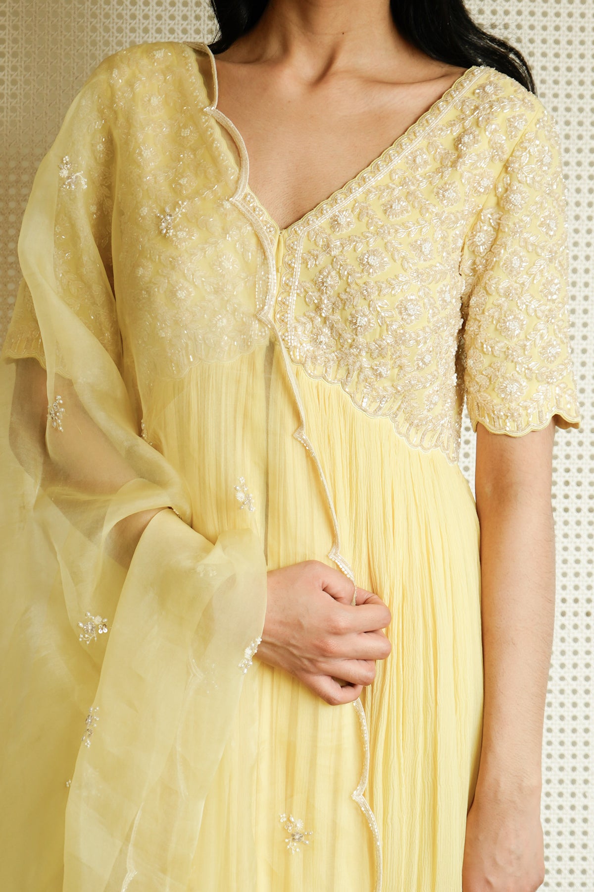 Adorn yourself in our breathtaking Yellow Chiffon Maxi, featuring intricate cutdana embroidery. This elegant front-open design offers unparalleled grace for any grand affair. Perfect for bridesmaids, a distinguished wedding guest, sangeet, or cocktail evenings. Experience luxurious comfort and sophisticated style, making it ideal occasion wear. A captivating statement piece for your wardrobe