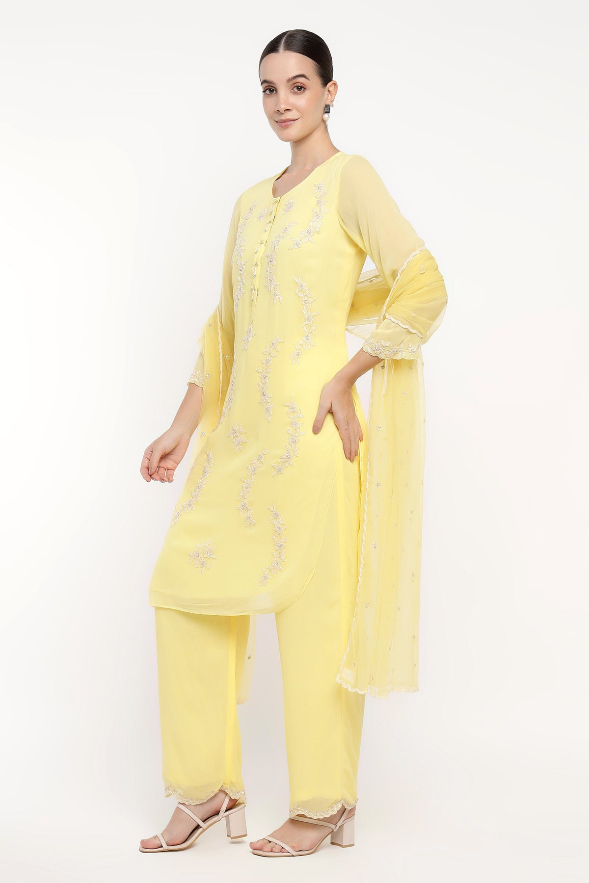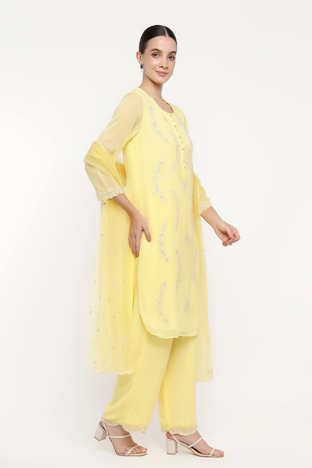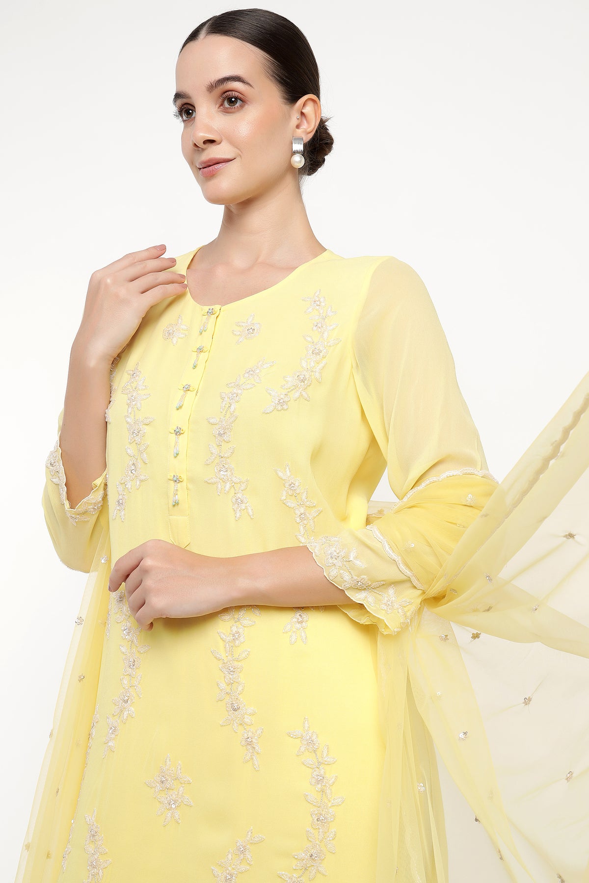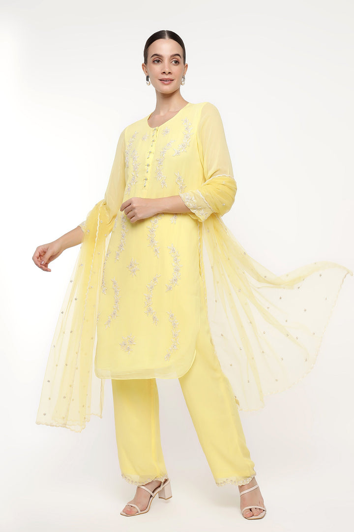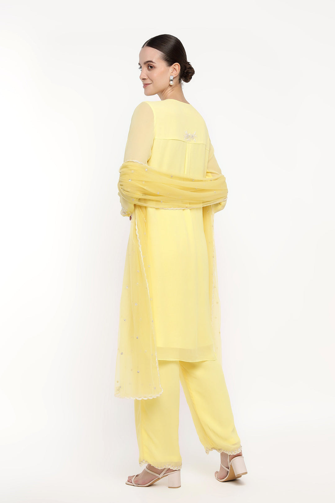 Radiate elegance in the Selene Yellow Georgette Kurta Set, adorned with exquisite cutdana embroidery. This light, embroidered kurta set is perfect for Rakhi, Eid, satsang, or wedding functions. An essential festive kurta set, it adds timeless grace to any trousseau.