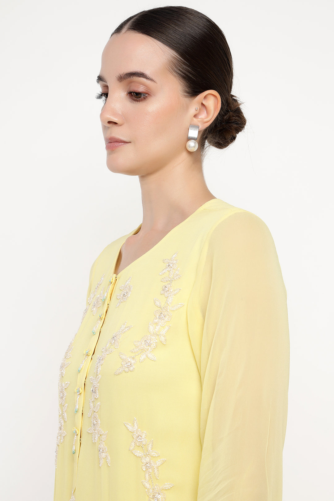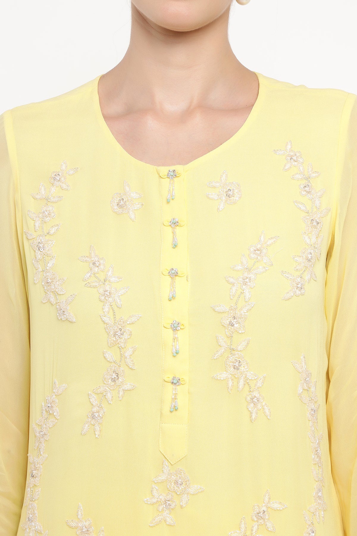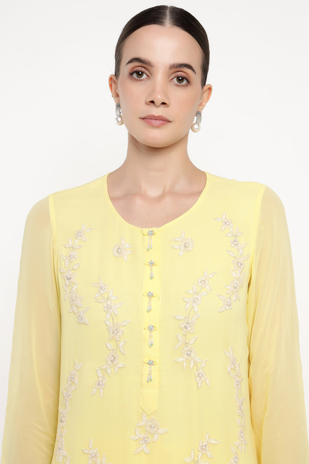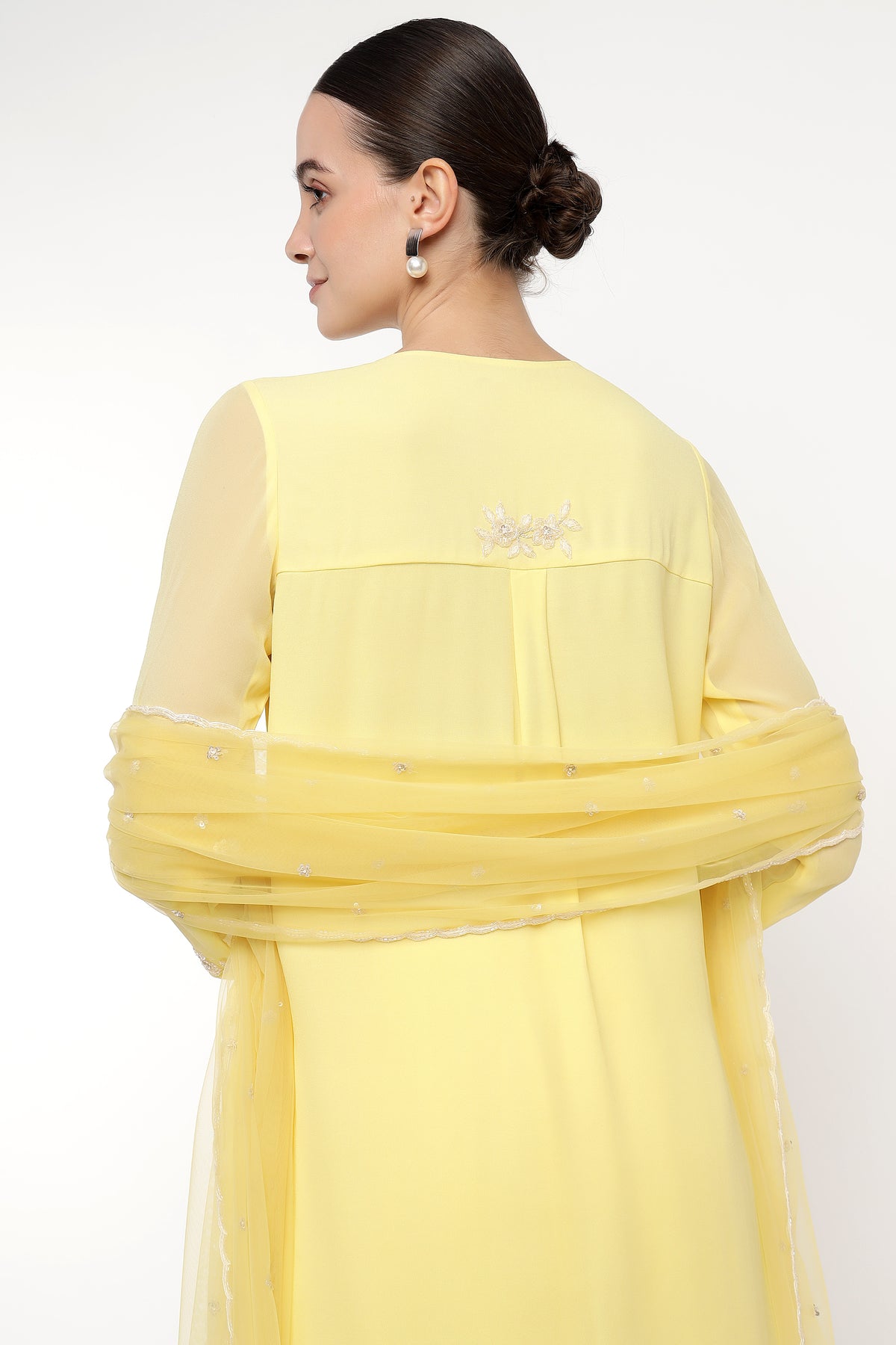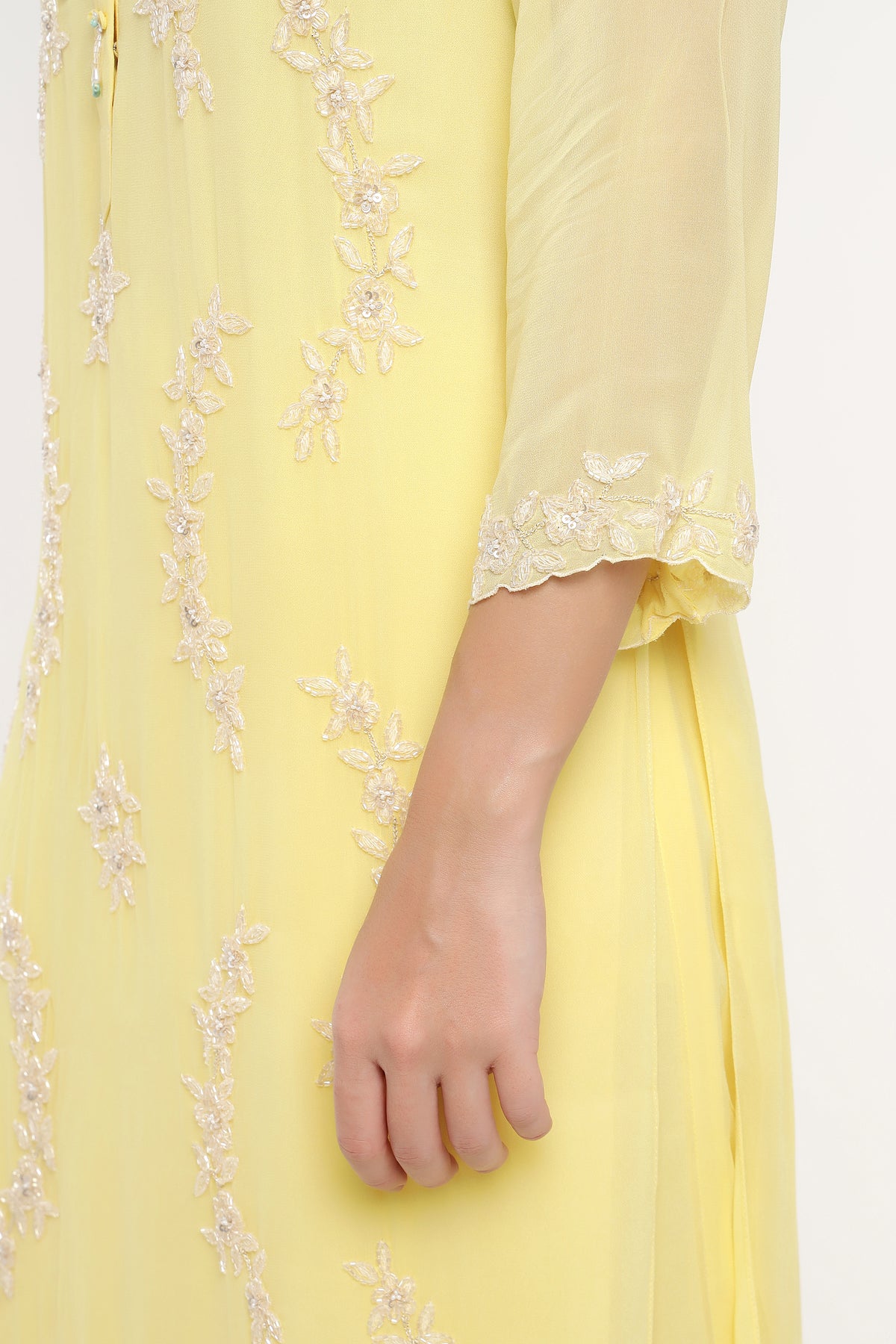 Radiate elegance in the Selene Yellow Georgette Kurta Set, adorned with exquisite cutdana embroidery. This light, embroidered kurta set is perfect for Rakhi, Eid, satsang, or wedding functions. An essential festive kurta set, it adds timeless grace to any trousseau.